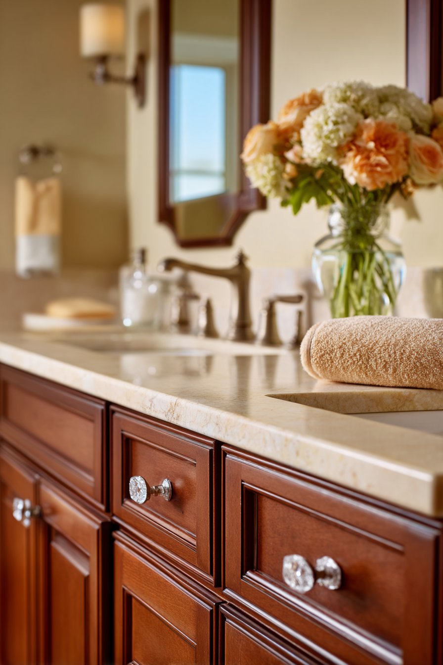 The warm beige quartzite countertop displays subtle gold veining that picks up the warm tones in the cherry cabinetry while providing a durable, low-maintenance surface ideal for bathroom use. Quartzite offers the beauty of natural stone with enhanced durability, resisting scratching, staining, and etching better than marble while maintaining that luxurious appearance. Wall-mounted faucets in antique brass create a sophisticated look while freeing up counter space and making cleaning easier—a perfect blend of form and function.