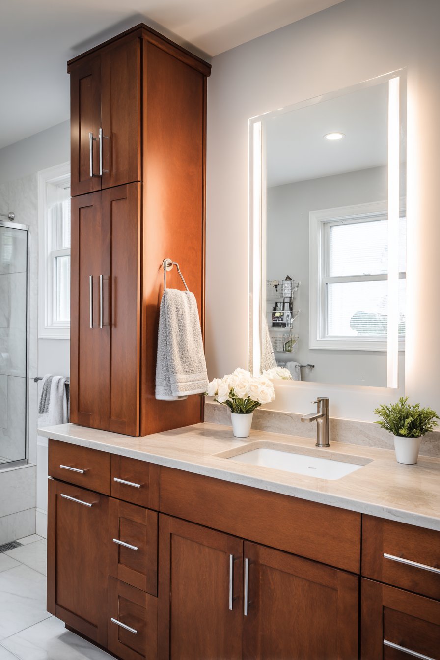 - Ensure adequate ventilation to protect wood cabinetry from moisture damage in the humid bathroom environment