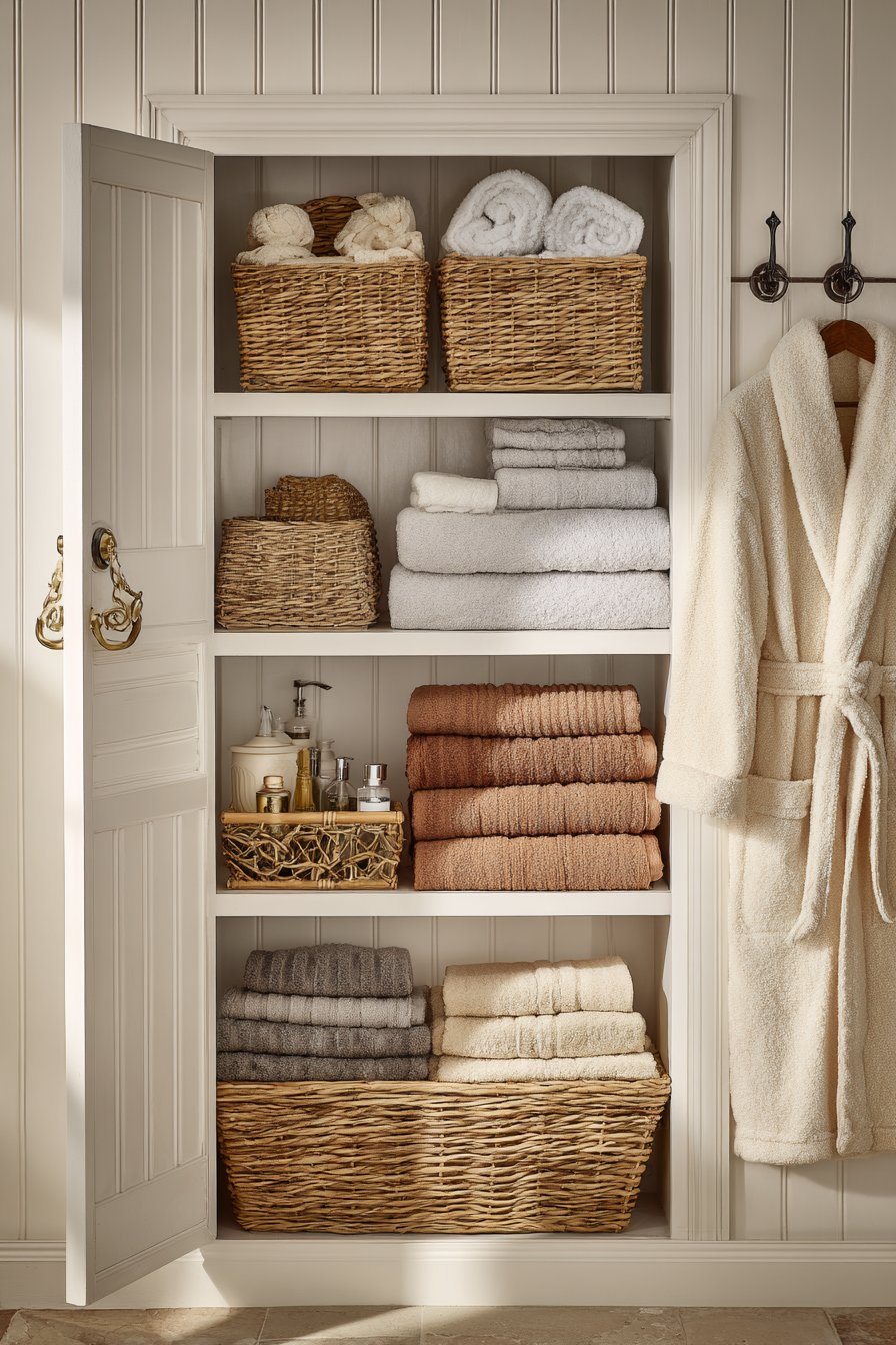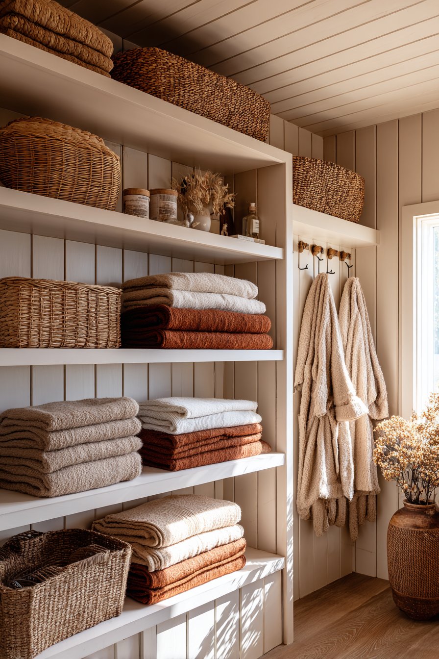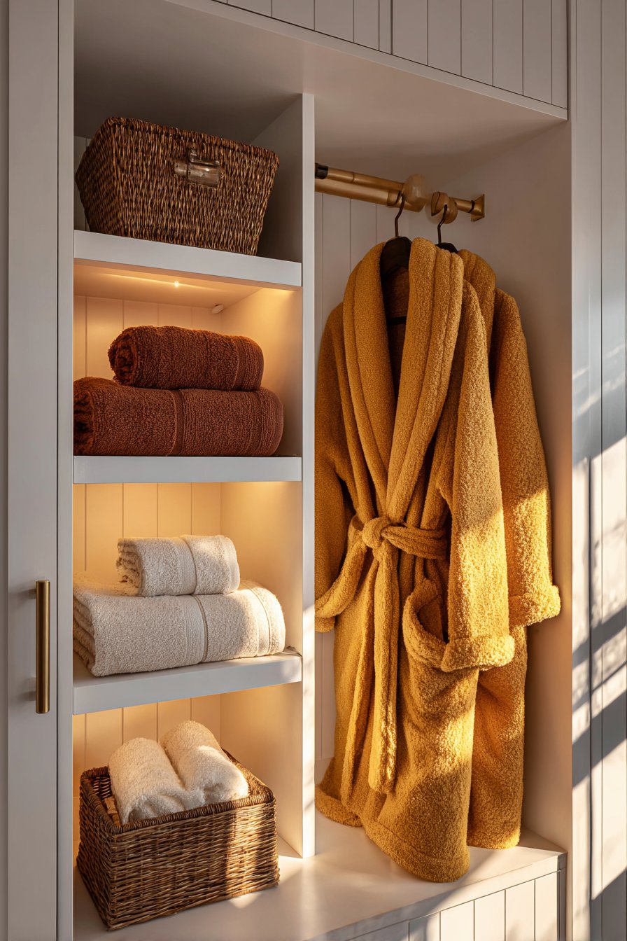 Open shelving within the closet displays woven baskets in natural rattan alongside neatly folded towels in rust and cream colors, creating a visually pleasing composition that’s both practical and beautiful. The transparency of open storage encourages organization and makes items easy to locate, while the warm materials and colors ensure the display enhances rather than detracts from the bathroom’s aesthetic. Brass hooks mounted on the side or front of the storage unit hold plush robes, adding convenience while contributing another warm metallic accent to the design.