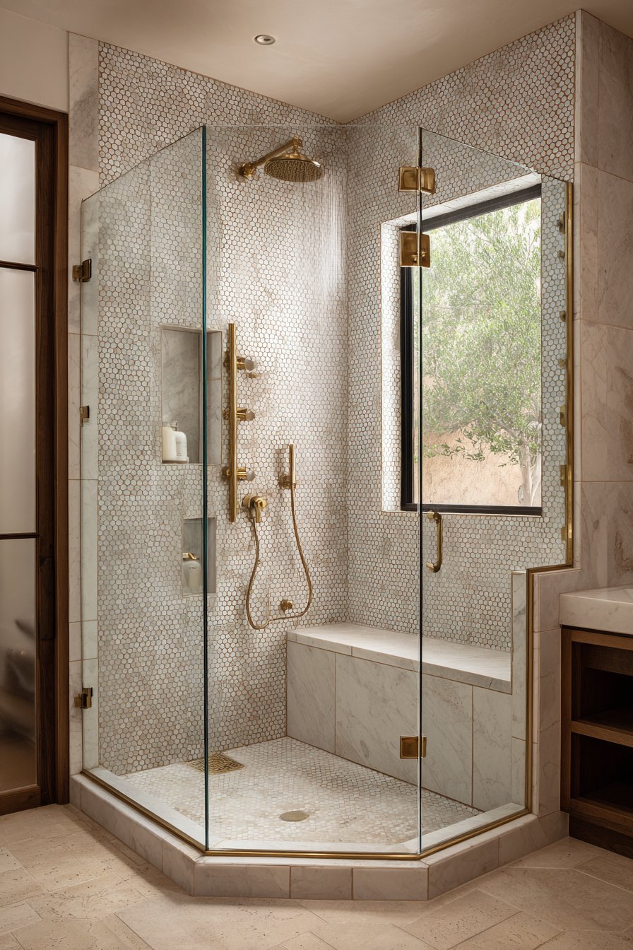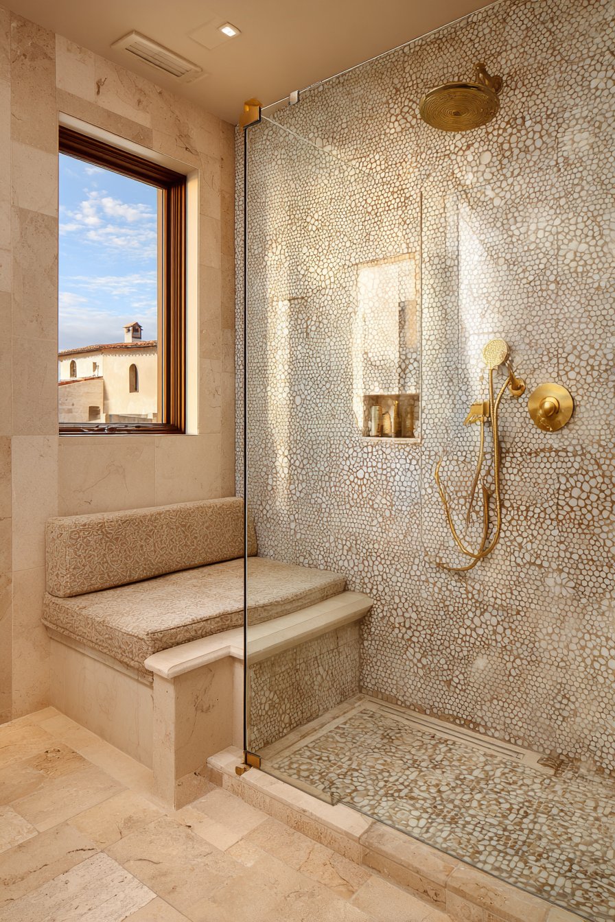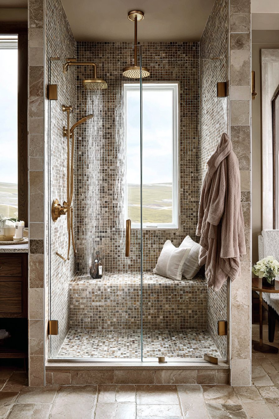 The shower enclosure becomes a jewel box in this design, with frameless glass revealing walls clad in small-format tiles arranged in a warm taupe and cream mosaic pattern. The beauty of mosaic tiles lies in their ability to create visual interest and texture while maintaining a cohesive color scheme, with the interplay of the two warm neutrals adding depth without contrast. The small scale of the tiles also provides excellent slip resistance on the shower floor, making this design choice as practical as it is beautiful.