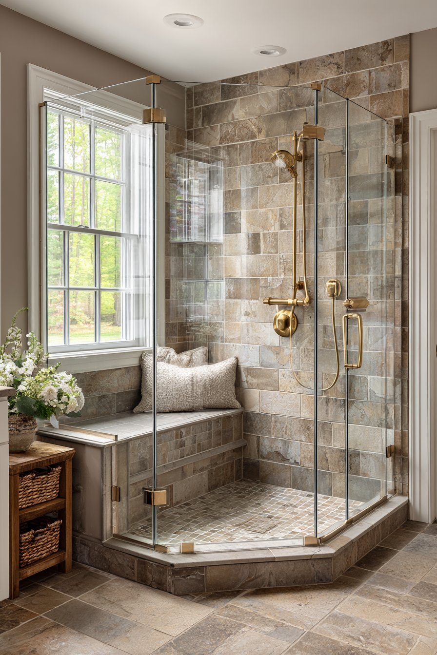 Brushed gold shower fixtures and handheld wand complete the setup with warmth and functionality, the handheld feature adding versatility for everything from washing hair to cleaning the shower itself. Natural light from a privacy window creates soft highlights on wet surfaces, making the water droplets sparkle like crystals while the warm tones in the tile absorb and reflect the light in beautiful ways. The presence of natural light in the shower transforms it from a purely functional space to one where you might linger, enjoying the play of light and water.