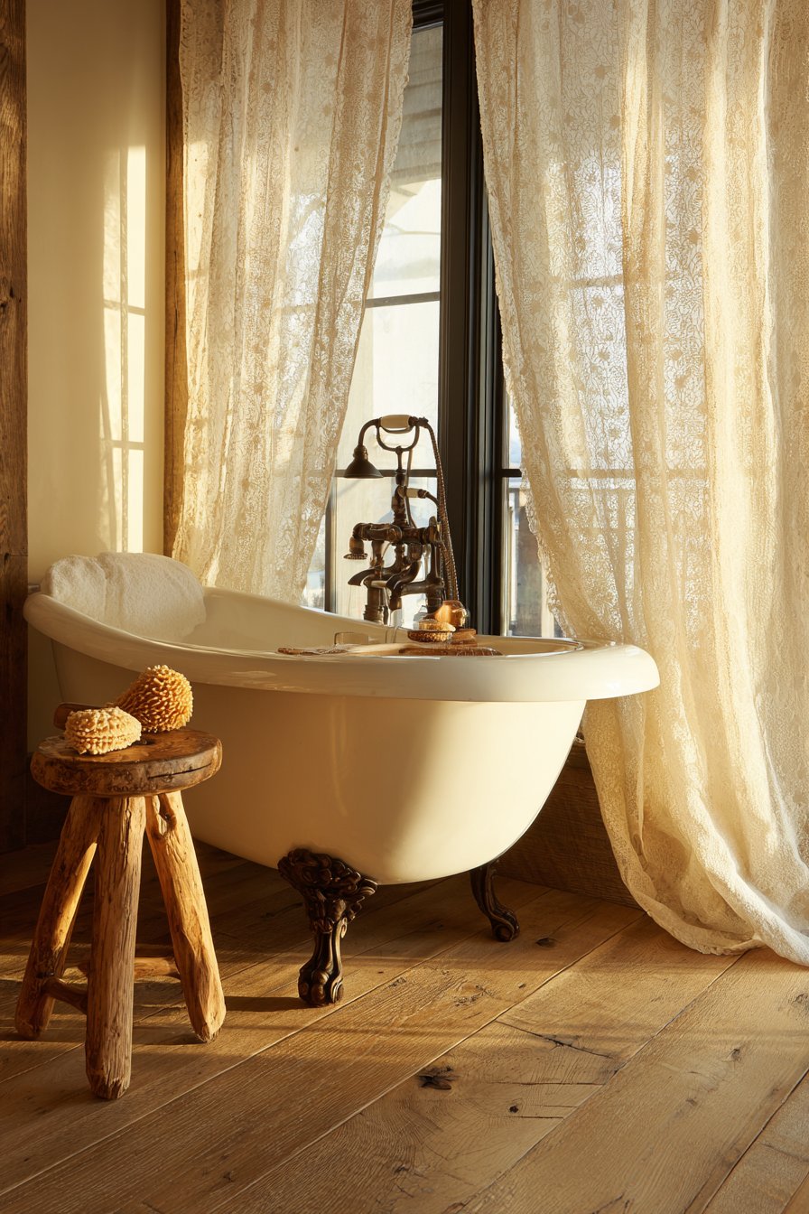 A small wooden stool holds artisan soaps and a natural sea sponge, adding both functionality and styling opportunity to the tub area. These carefully chosen accessories enhance the vintage spa atmosphere while remaining entirely practical. The wide-plank oak flooring, treated with a natural oil finish rather than polyurethane, develops a beautiful patina over time and can be spot-repaired if damaged, making it an excellent long-term choice for bathroom flooring despite common misconceptions about wood in wet spaces.