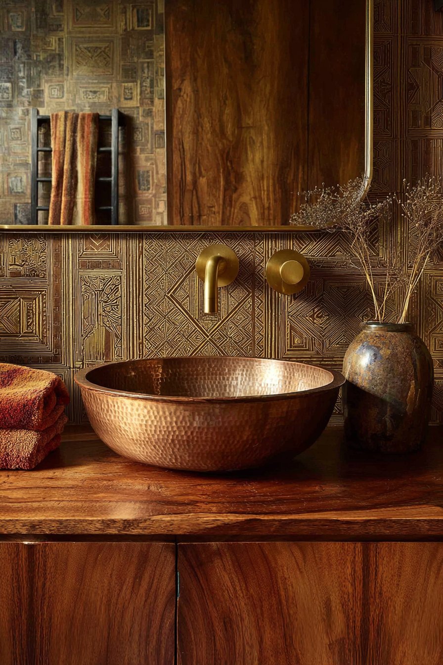 Textured wallpaper in a warm geometric pattern adds visual interest and personality without overwhelming the small room, provided you choose a pattern with appropriate scale. In small bathrooms, wallpaper can actually make the space feel more finished and intentional than painted walls, particularly when you select patterns with warm colors and organic geometries that complement rather than compete with the other elements. The key is ensuring adequate ventilation to prevent moisture damage to the paper over time.