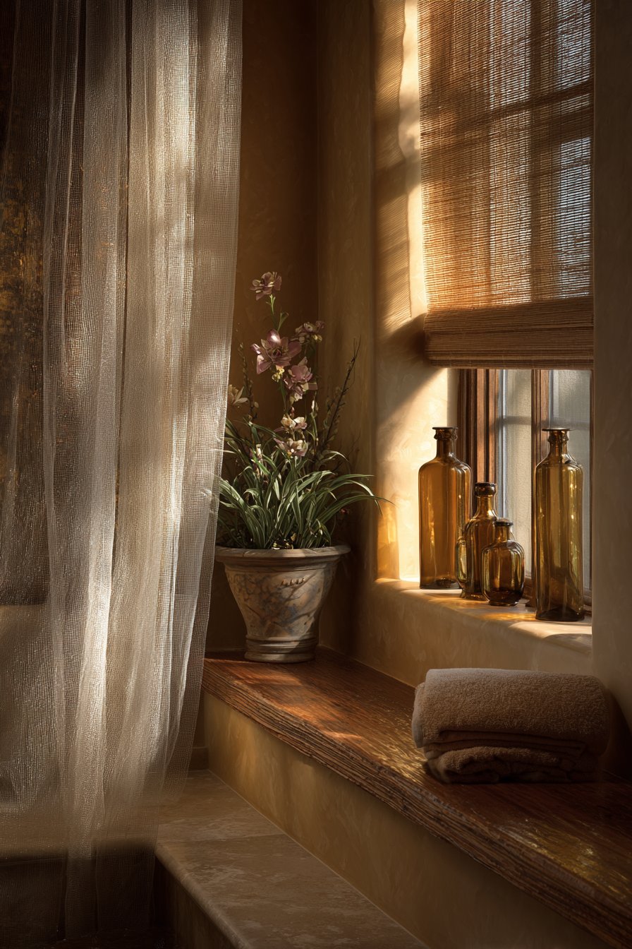 The window sill in sealed teak displays potted plants and amber glass bottles, transforming a typically underutilized space into a styling opportunity that enhances both the warmth and the natural feel of the room. Plants in bathrooms thrive due to the humidity, while their presence brings life and color that complements the warm design. The amber glass bottles might hold bath oils, salts, or simply serve as decorative elements, their translucent color glowing beautifully when backlit by afternoon sun.