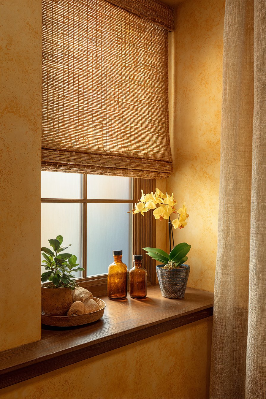 Surrounding walls in warm buff color complement the natural materials without competing for attention, creating a harmonious backdrop that allows the window area to shine. The addition of a sheer linen privacy curtain adds softness and another layer of light filtration, creating a flexible system where you can adjust privacy and light levels according to your needs. The layering of the bamboo shade with the linen curtain also adds visual depth and texture, making the window treatment itself a design feature worth attention.