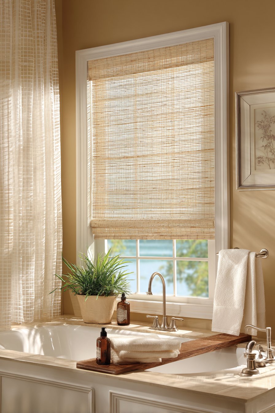 Windows in bathrooms present a unique design challenge, requiring privacy while still allowing natural light to enhance the space. This design solves that problem beautifully with natural bamboo Roman shades that filter sunlight into warm golden rays, creating an instant atmosphere of natural serenity. The woven texture of the bamboo adds organic visual interest while the natural honey tones of the material contribute to the warm color palette throughout the room.