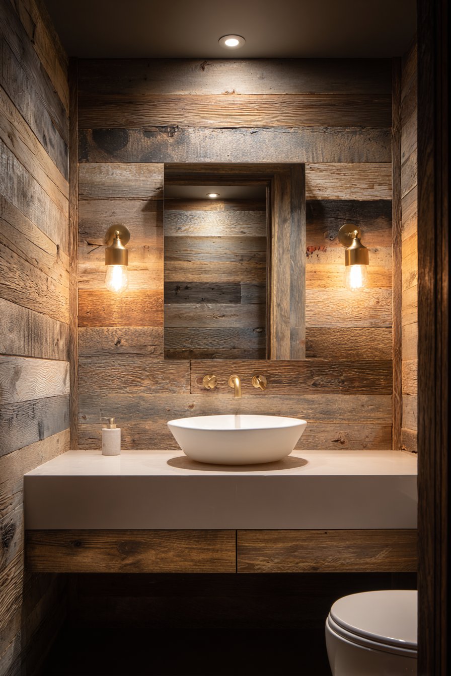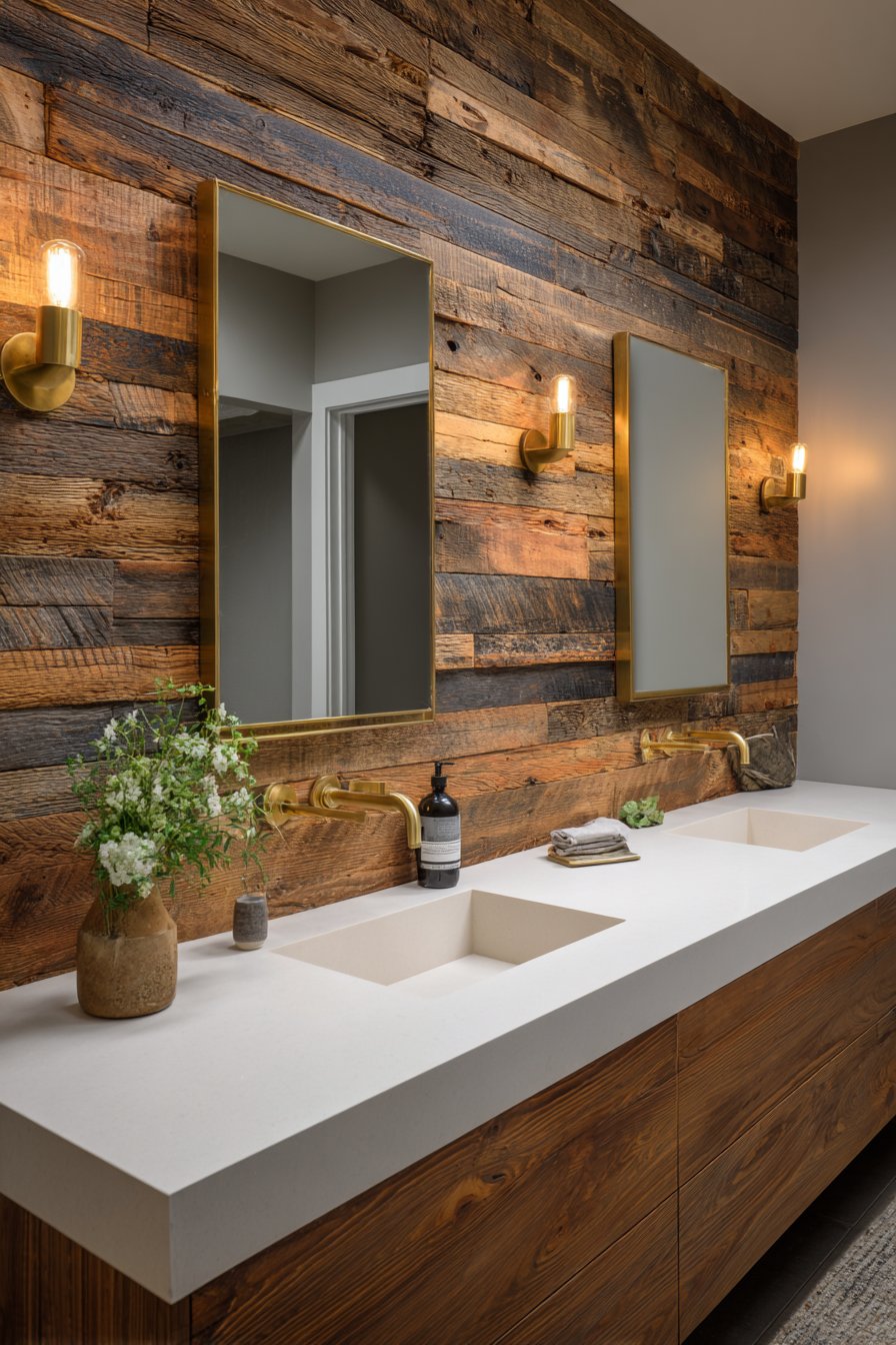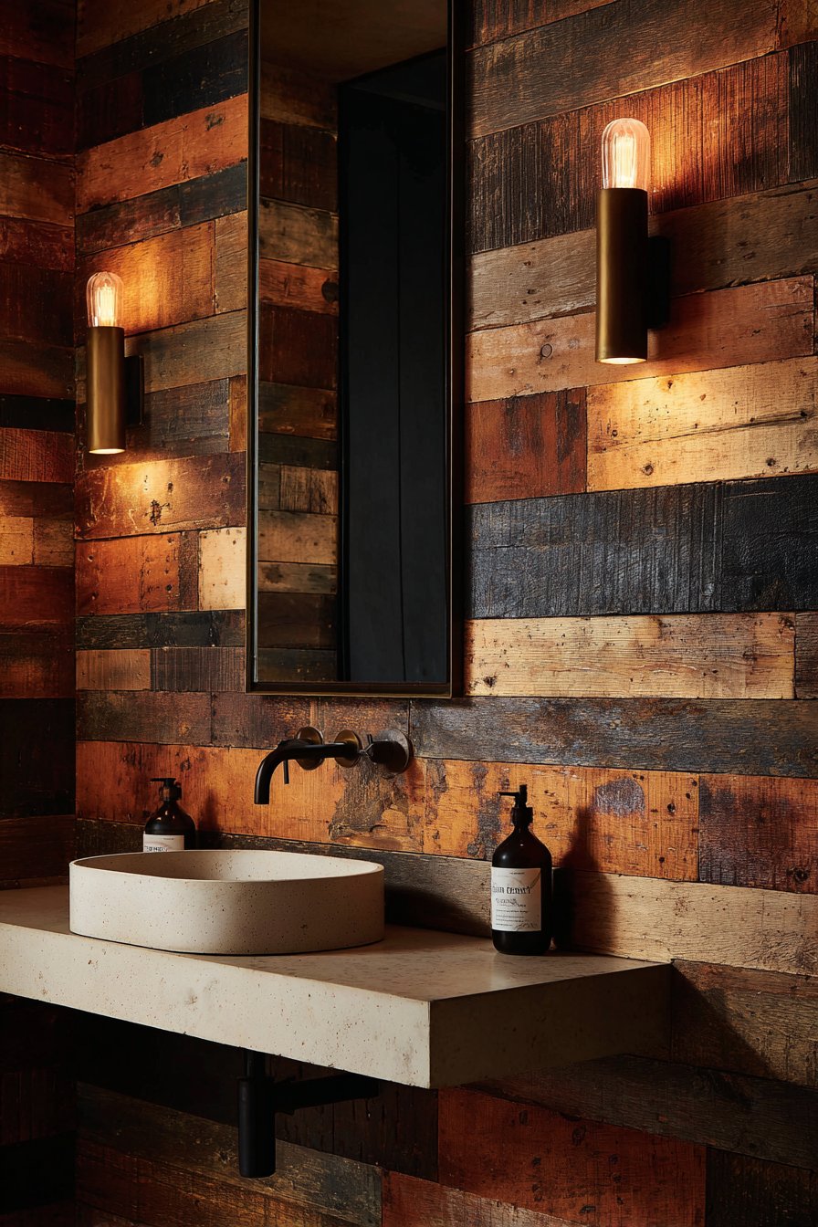 An accent wall can transform a bathroom from ordinary to extraordinary, and when that wall features reclaimed wood planks in varied warm tones from honey to deep amber, the impact is nothing short of stunning. The horizontal installation of the planks creates a sense of width, making the bathroom feel more expansive while the varied tones within the wood tell stories of age and previous lives. Each plank’s unique character—knots, nail holes, color variations—contributes to an overall tapestry of texture that machine-made materials simply cannot replicate.