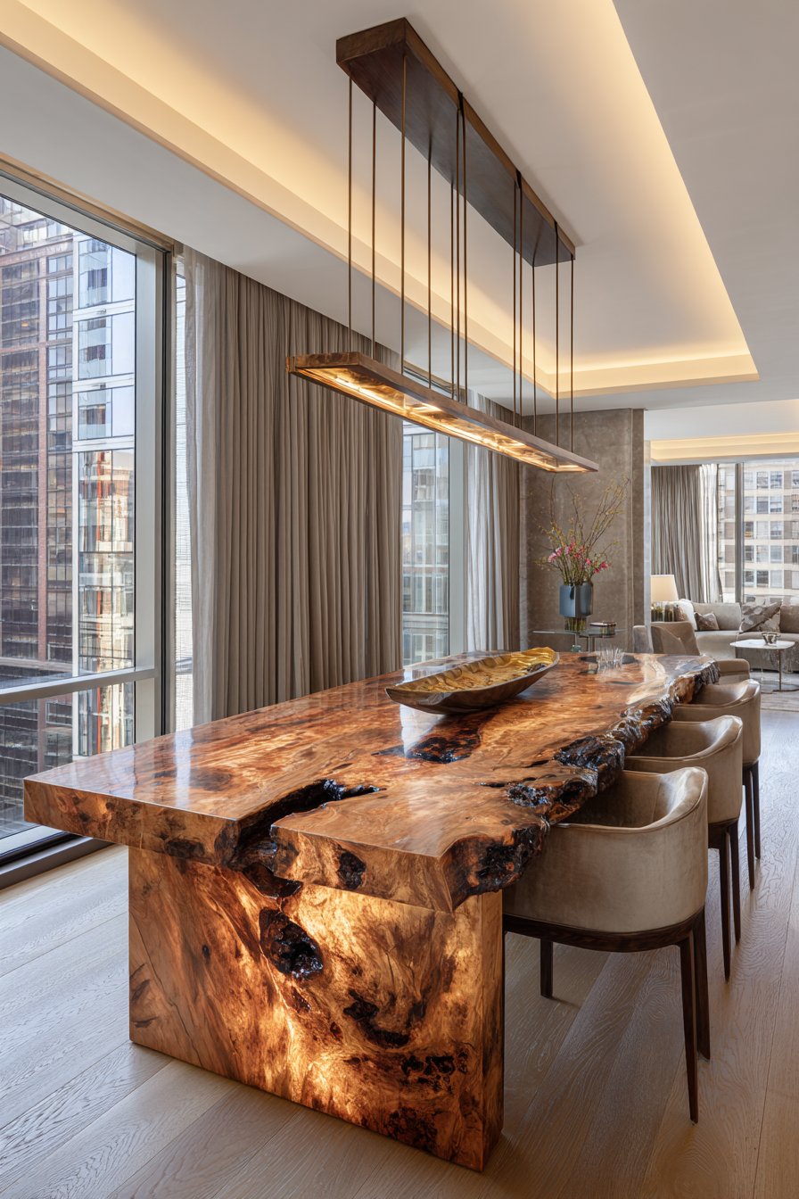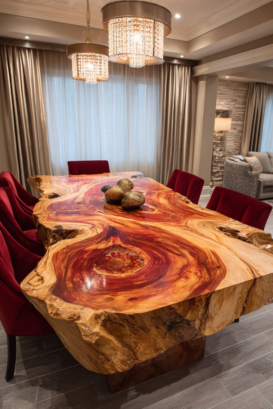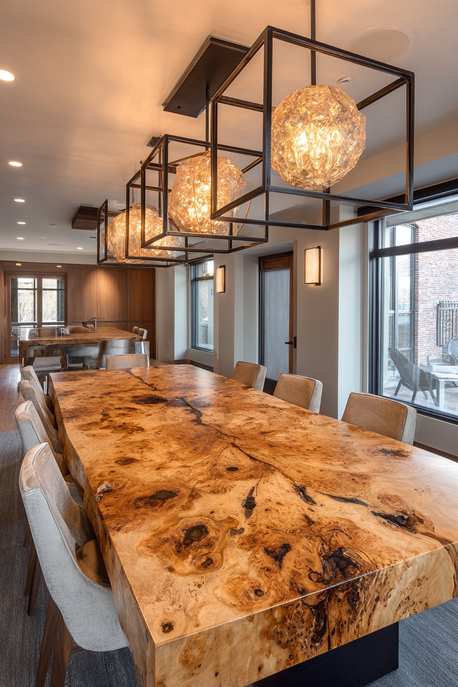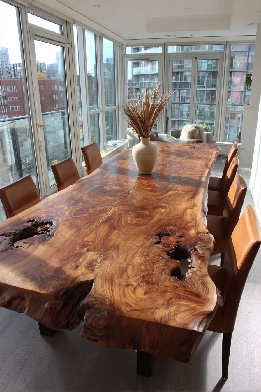 Key Design Tips: Work with specialists experienced in burl wood’s unique challenges and opportunities. Expect premium pricing due to rarity and processing difficulty. Apply clear finishes that enhance figure without obscuring patterns. Plan lighting carefully to showcase the wood’s three-dimensional qualities. Choose luxurious seating appropriate to the table’s special status. Protect the surface carefully—burl wood contains irregular grain that can be more fragile than straight-grained wood. Consider professional installation due to weight and value. Understand that burl patterns vary dramatically—see the actual wood before committing to ensure it matches your aesthetic preferences.