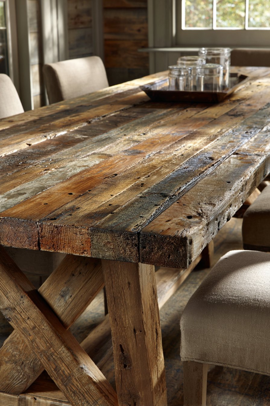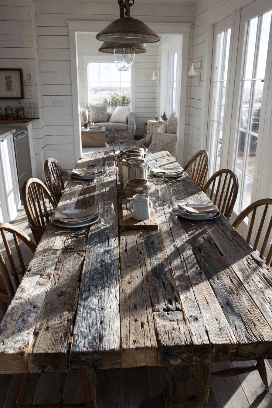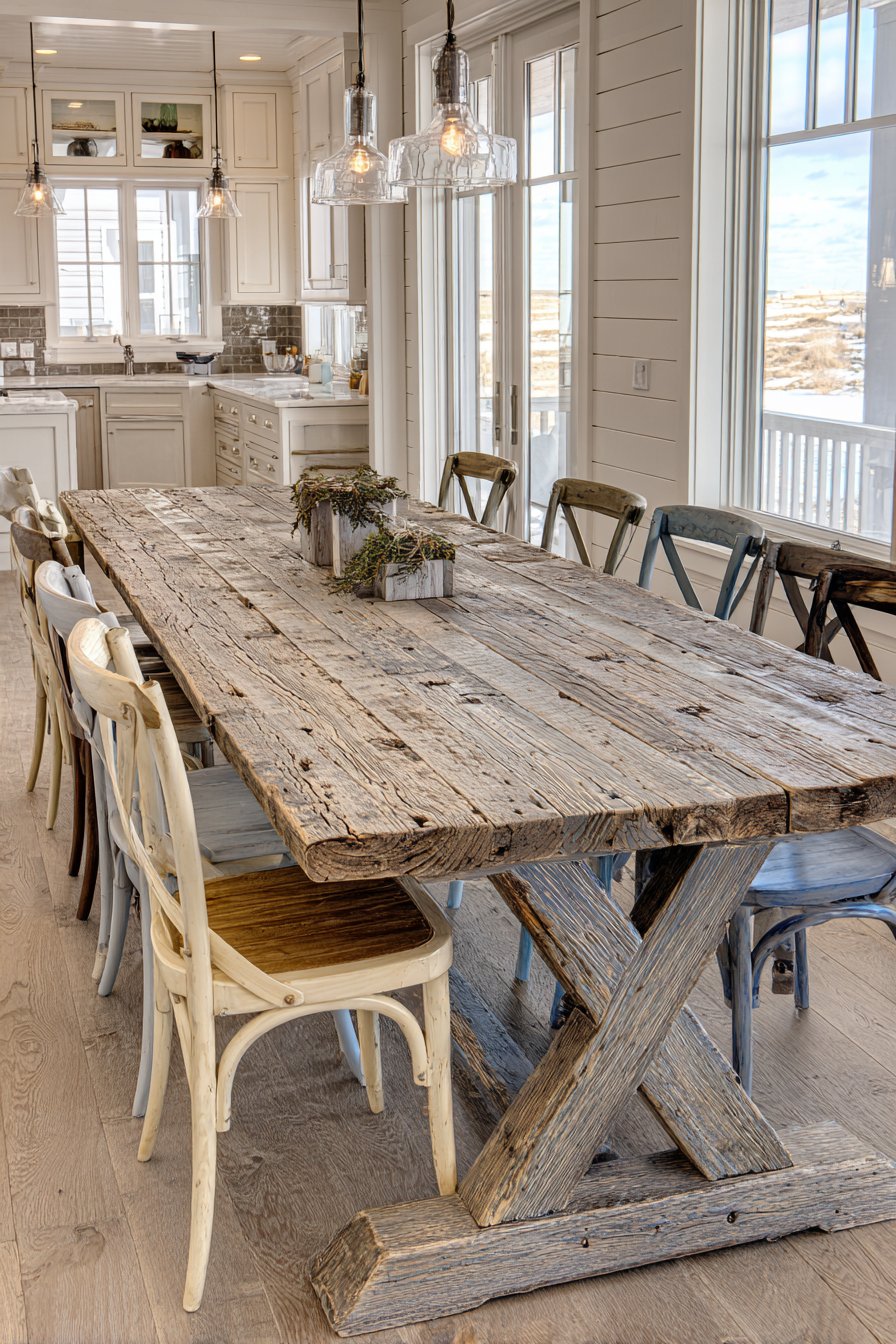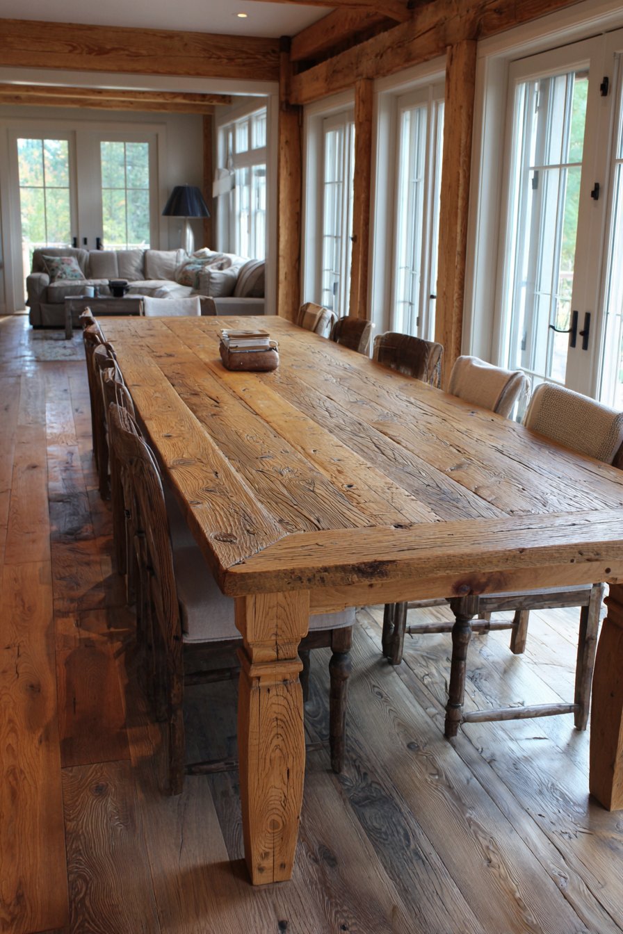 This design celebrates imperfection as beauty, where saw marks, nail holes, and color inconsistencies aren’t flaws but features that distinguish reclaimed wood from new construction. The substantial presence of barn wood brings architectural weight to the room, grounding the space with a sense of permanence and connection to agricultural heritage. Every meal at this table feels like a celebration of craftsmanship, sustainability, and the enduring appeal of materials with authentic stories to tell.