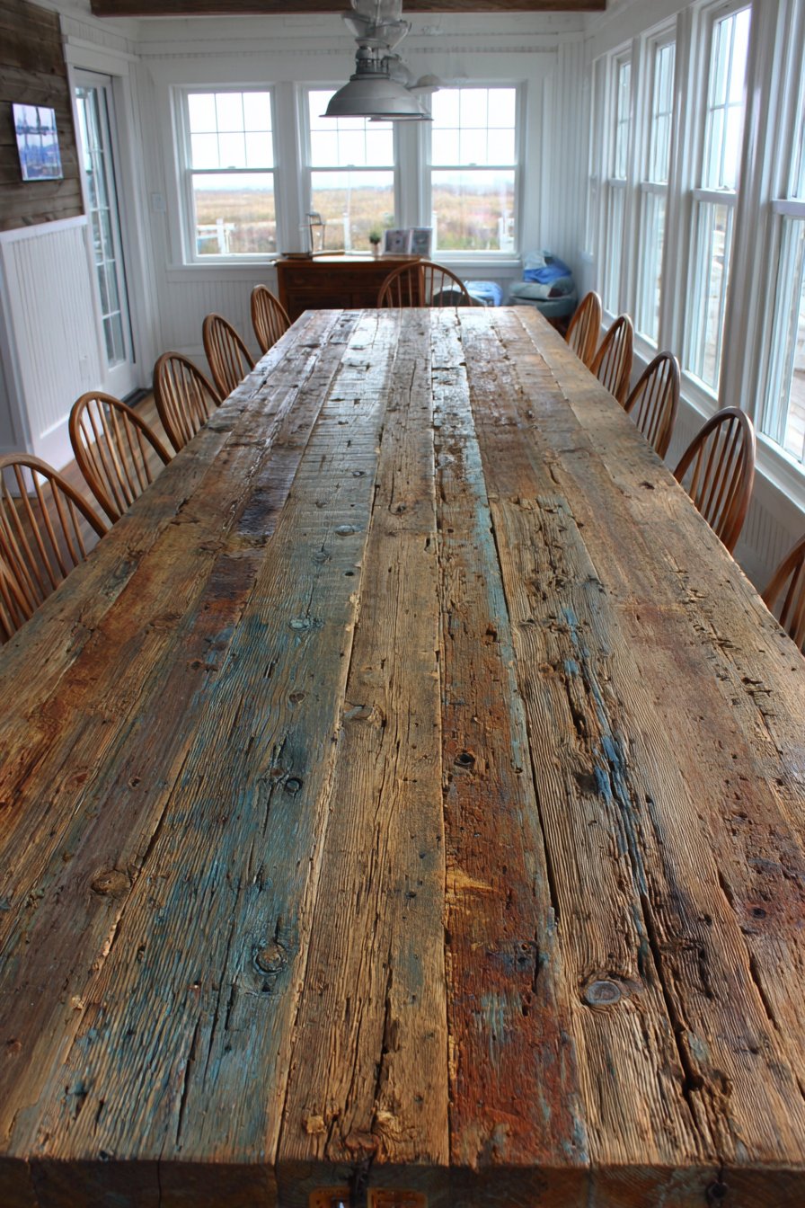The surrounding Windsor-style chairs in mixed finishes complement rather than match the table, embracing the farmhouse aesthetic’s appreciation for collected, lived-in charm. Overhead pendant lighting casts warm illumination across the surface, accentuating the dimensional qualities of the weathered wood and creating inviting shadows that emphasize its texture. Large windows flood the space with natural daylight, making the dining area feel open and welcoming while showcasing the wood’s genuine character marks—evidence of its previous life and sustainable repurposing.