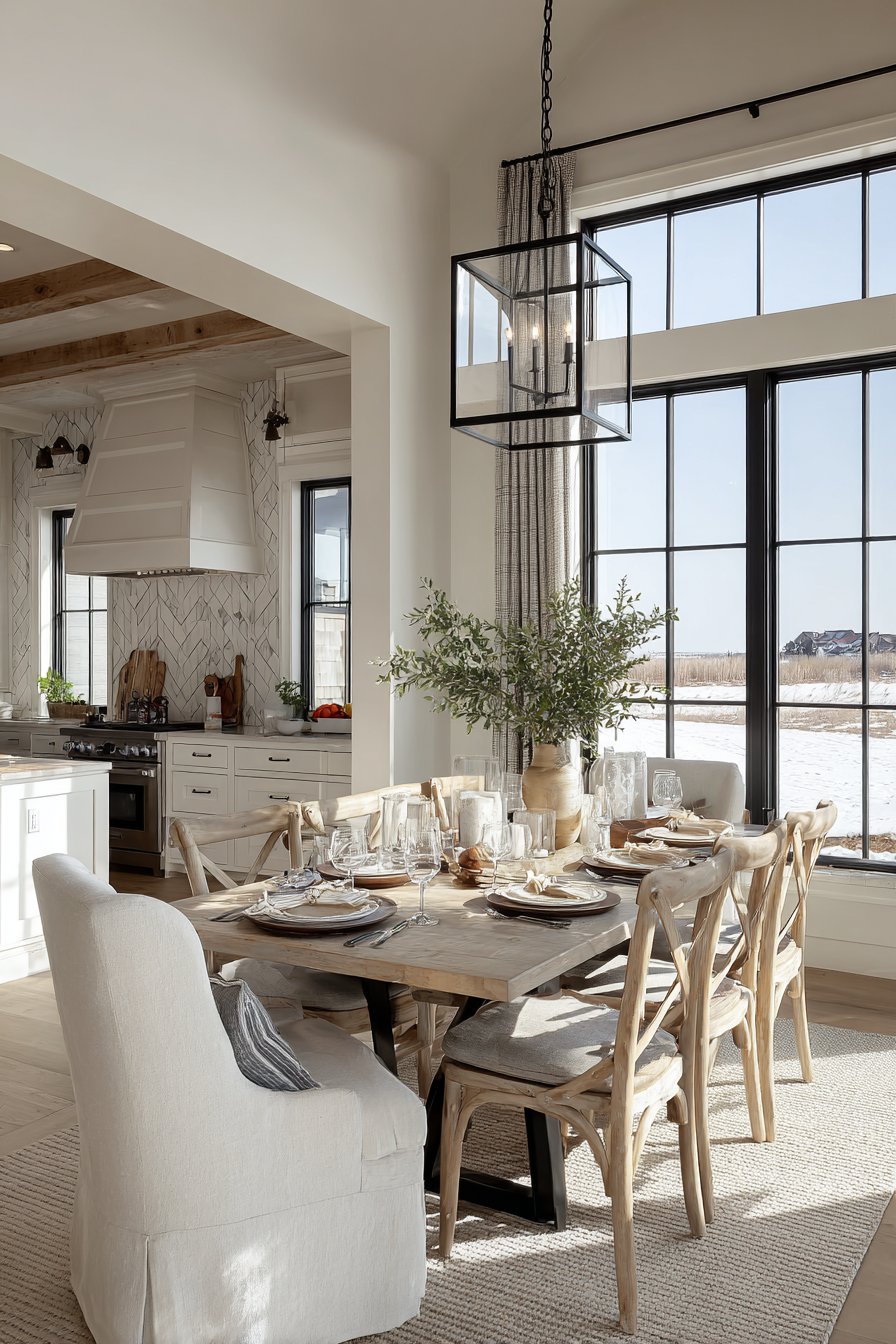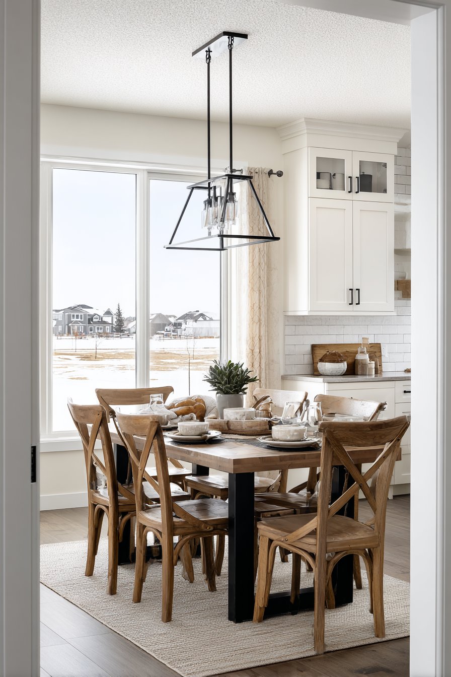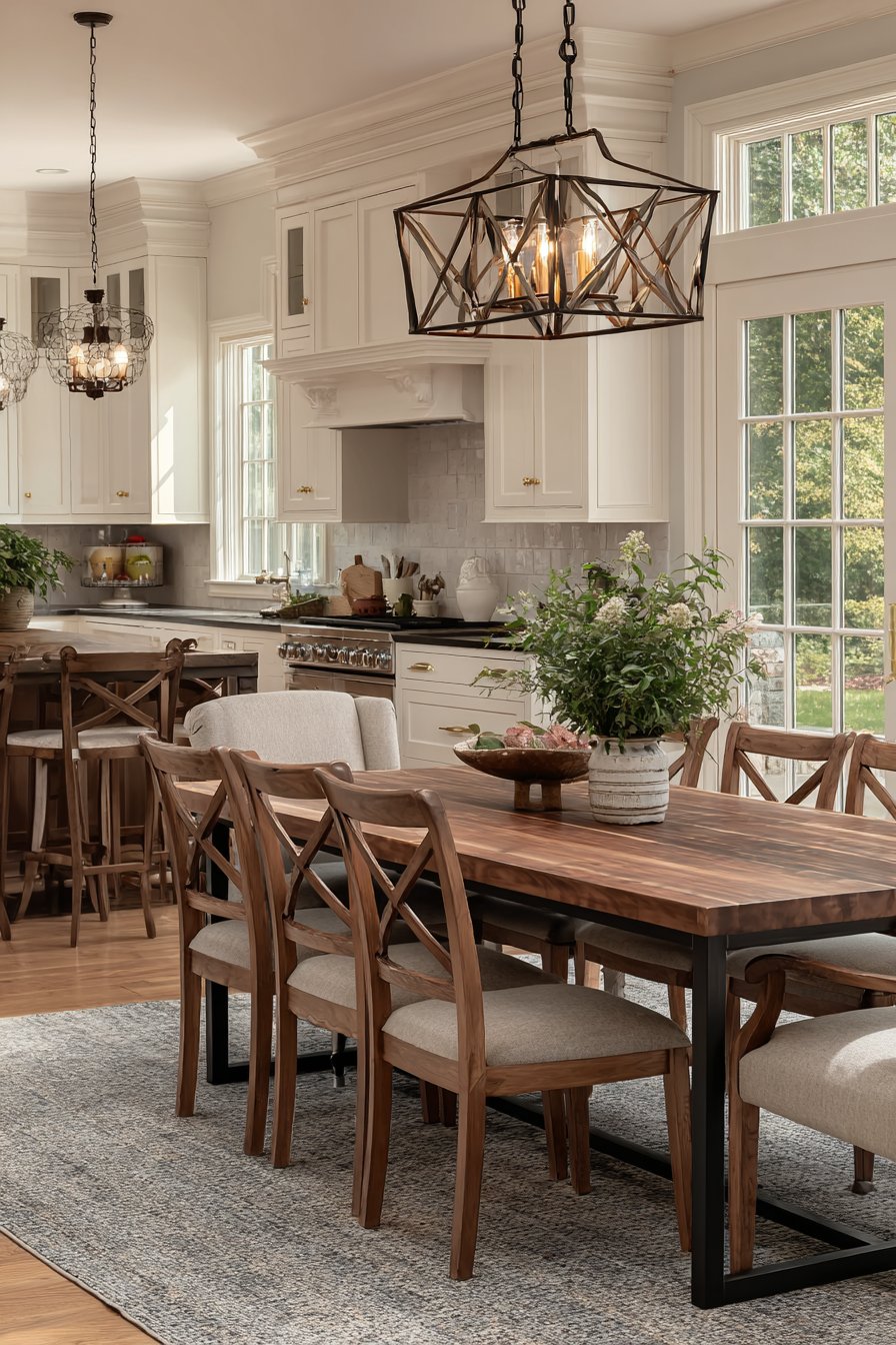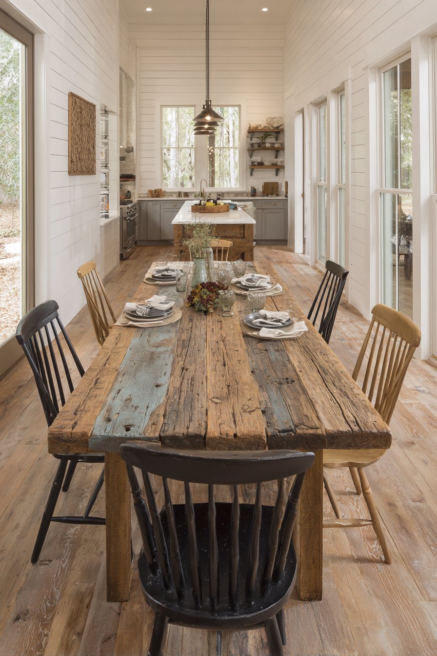 Key Design Tips: Source reclaimed barn wood from reputable suppliers who can verify origin and proper treatment. Apply food-safe sealants that protect without obscuring the wood’s natural character. Mix chair styles and finishes to enhance the collected farmhouse aesthetic. Install statement lighting above the table to create a focal point and provide task illumination. Maintain the wood with regular dusting and occasional conditioning to preserve its patina. Consider the table’s substantial weight when planning placement and ensure adequate floor support.