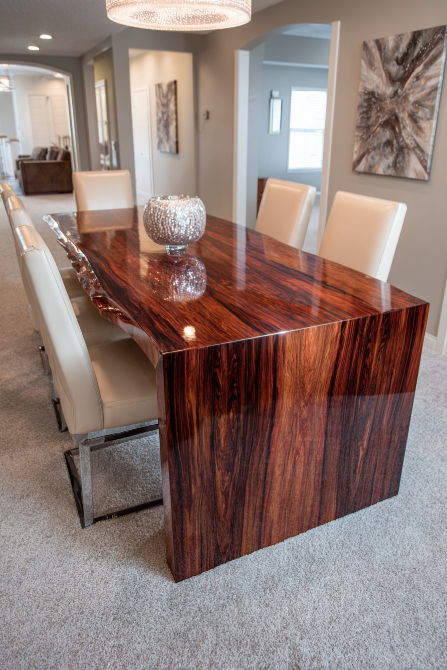 Key Design Tips: Source book-matched mahogany with consistent color and grain for seamless waterfall effect. Work with experienced craftspeople who have demonstrated skill in waterfall edge construction. Apply high-quality polyurethane or lacquer finishes in multiple thin coats for optimal clarity and depth. Choose modern chairs with clean lines that complement rather than compete with the table’s bold design. Protect the glossy finish from scratches with placemats and careful maintenance. Position lighting to showcase reflections and highlights on the polished surface. Budget appropriately—waterfall edge construction requires premium materials and advanced skills, commanding higher pricing than standard table designs.