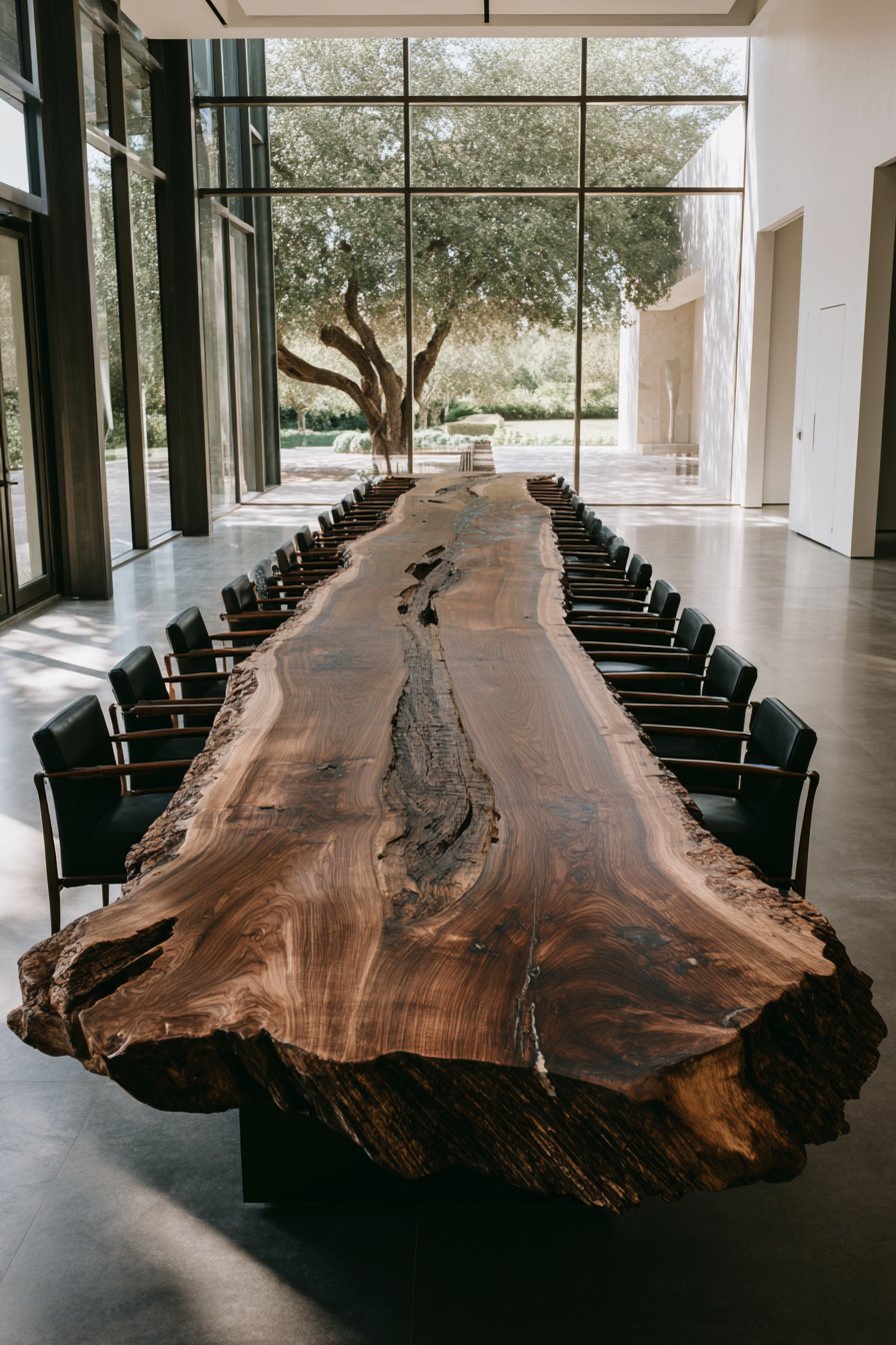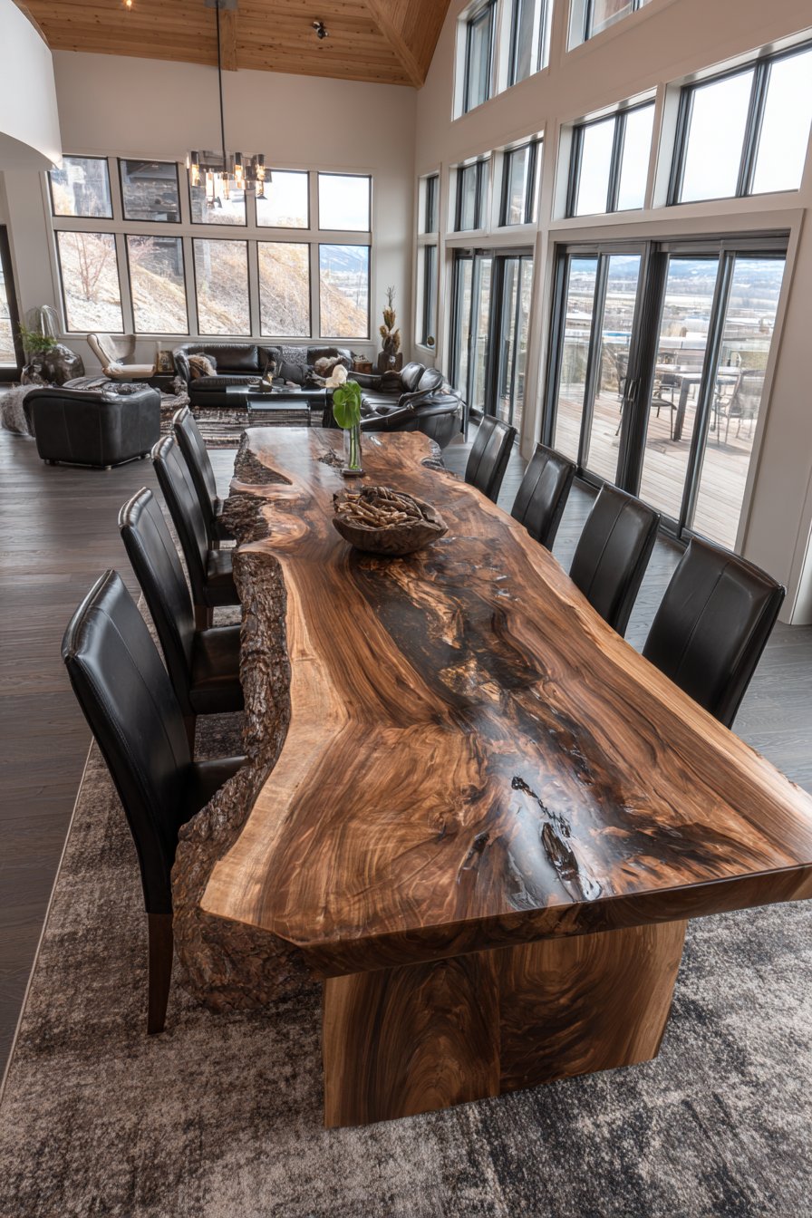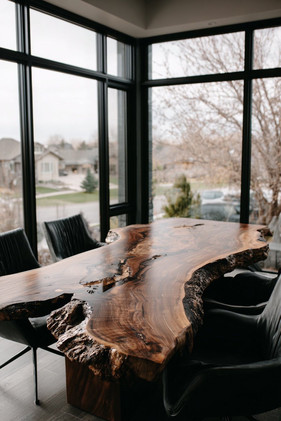 Positioned near floor-to-ceiling windows, the table receives abundant natural light that shifts throughout the day, constantly revealing new details in the wood’s complex grain patterns and highlighting the three-dimensional qualities of the live edges. Simple modern chairs in black leather provide necessary seating without competing visually with the table’s organic drama. The restraint shown in surrounding furnishings allows the walnut slab to command attention as the room’s undisputed focal point.
