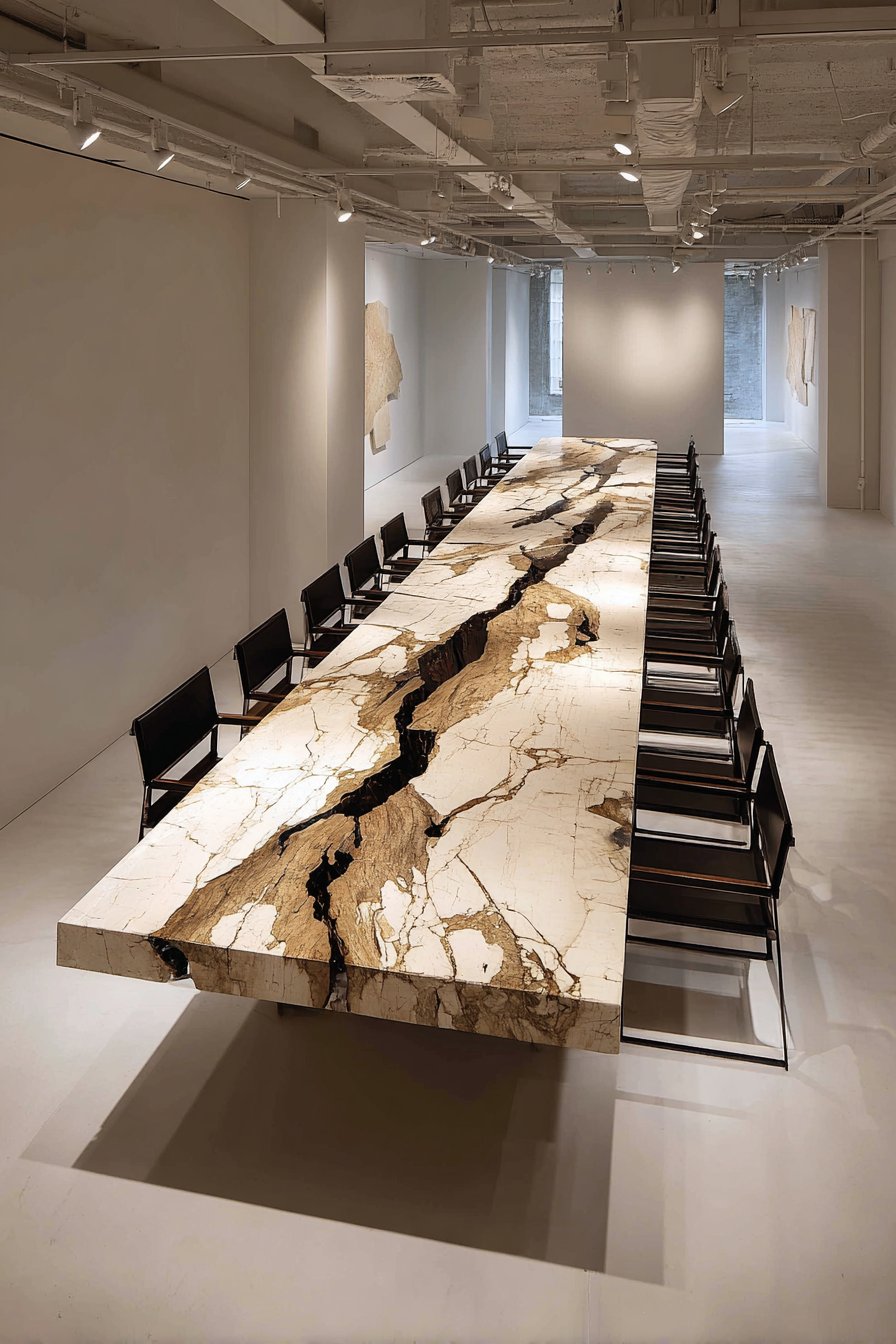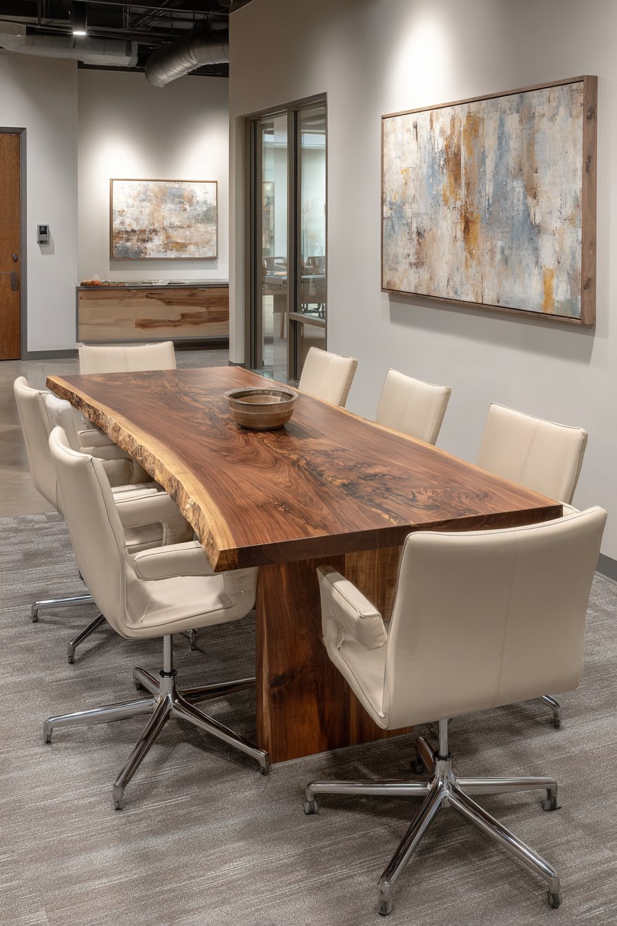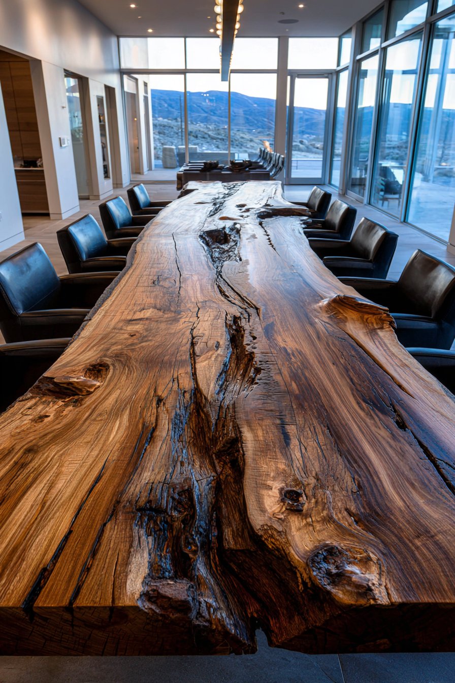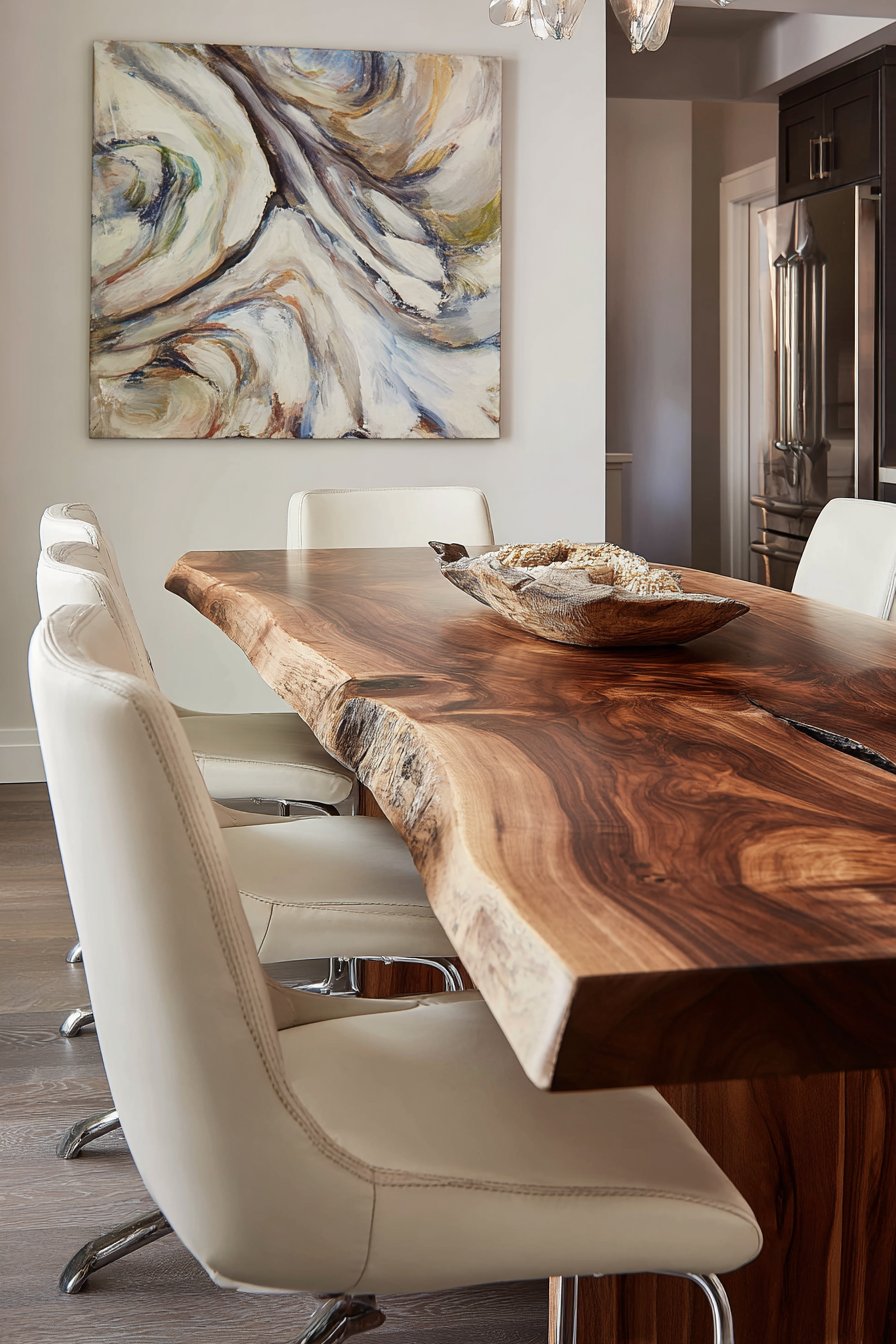 Positioned near floor-to-ceiling windows, the table receives abundant natural light that shifts throughout the day, constantly revealing new details in the wood’s complex grain patterns and highlighting the three-dimensional qualities of the live edges. Simple modern chairs in black leather provide necessary seating without competing visually with the table’s organic drama. The restraint shown in surrounding furnishings allows the walnut slab to command attention as the room’s undisputed focal point.