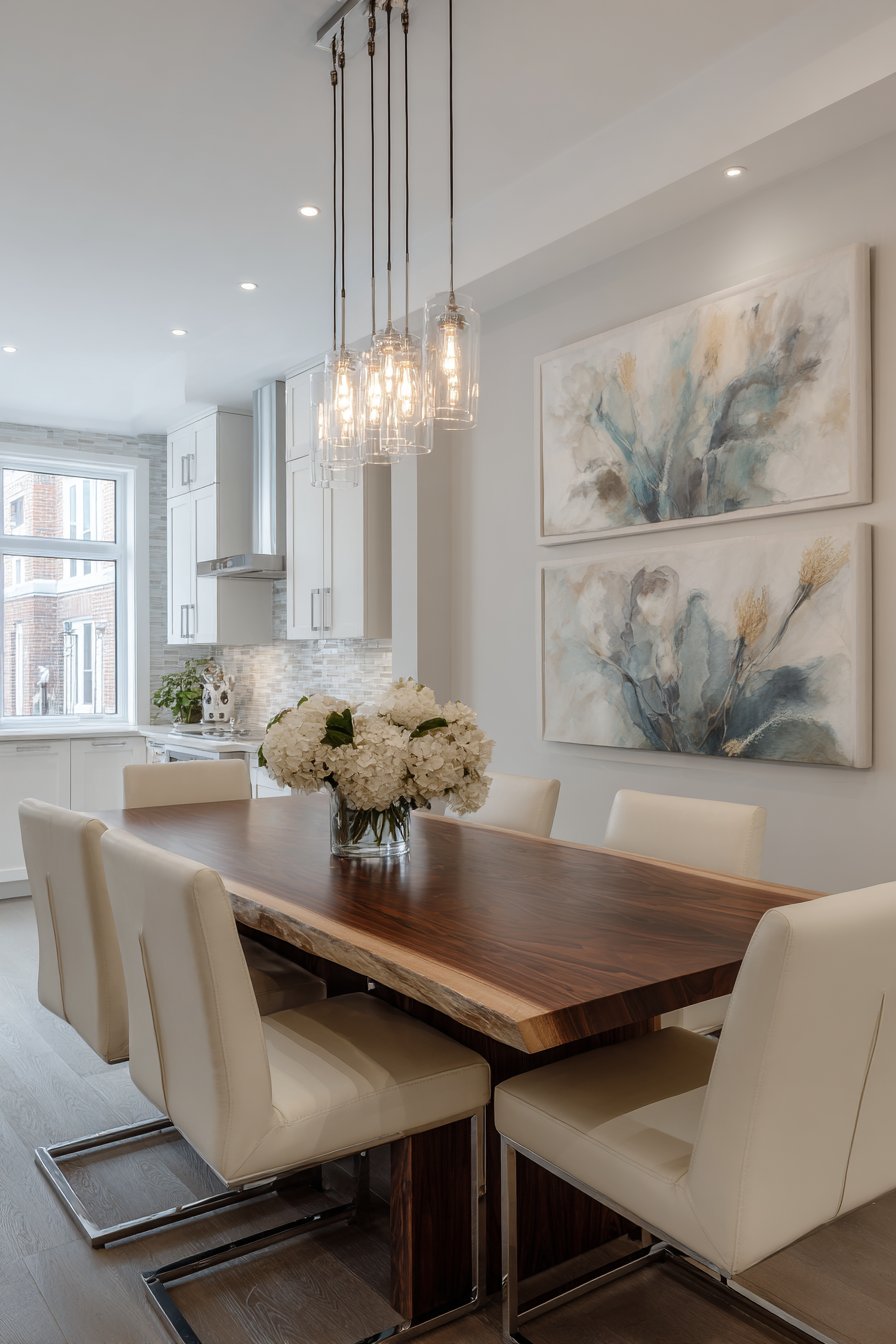 Six cream leather chairs with chrome bases surround the table, their sleek modern design complementing the table’s contemporary aesthetic while providing comfortable upholstered seating. Neutral wall colors and carefully selected abstract art create a gallery-like atmosphere that allows the mahogany’s natural beauty to command attention. The balance between glossy wood, soft leather, and reflective chrome creates textural variety that prevents the streamlined design from feeling cold or overly minimalist.