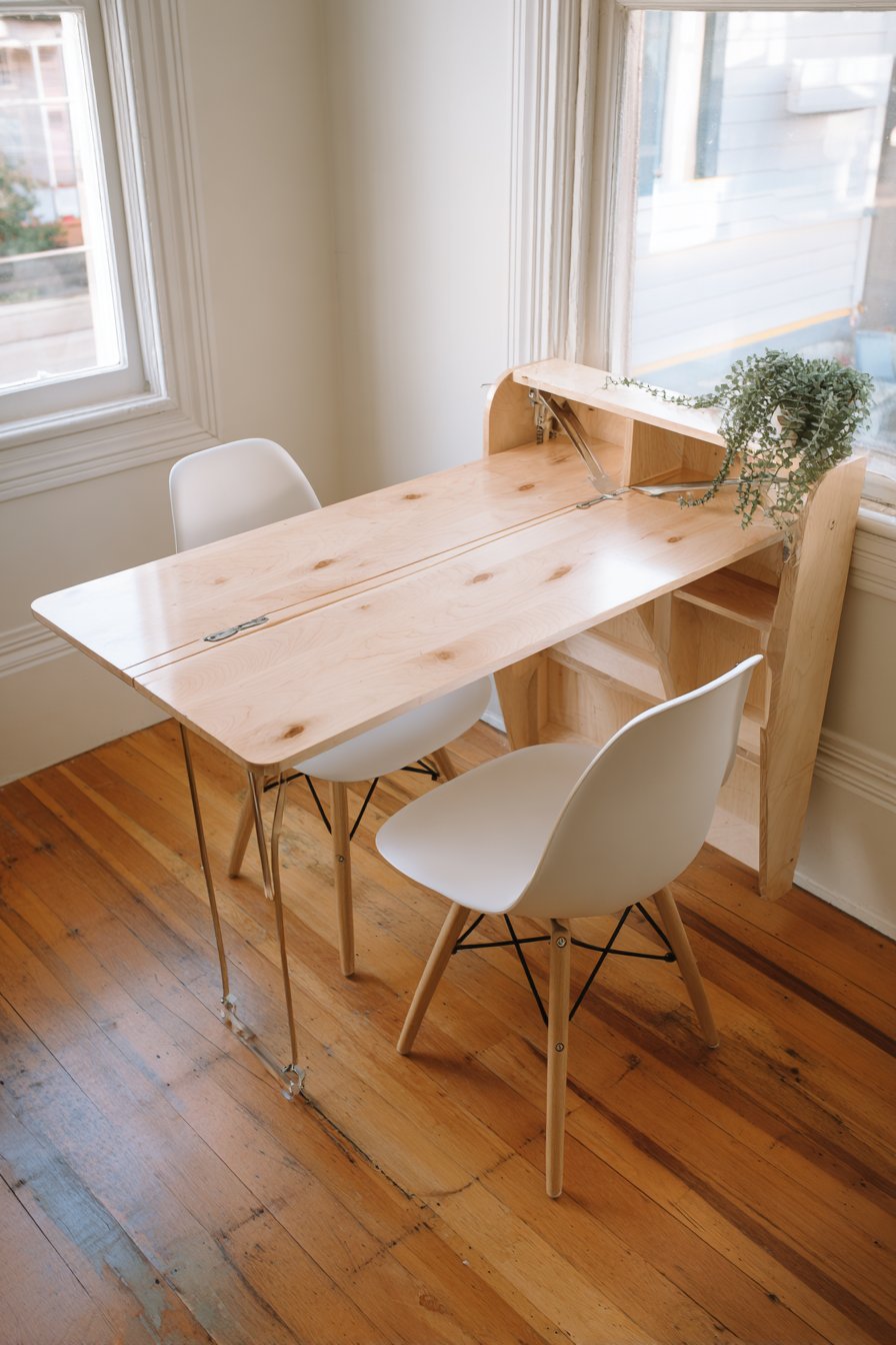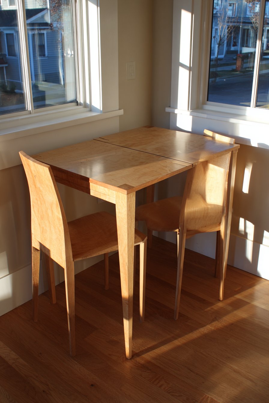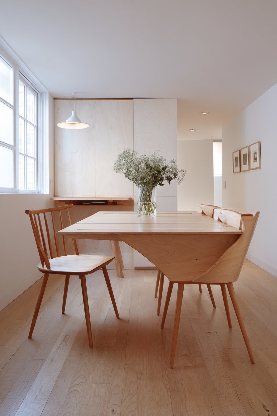 Positioned in a small apartment dining area with white walls and hardwood floors that complement the maple’s natural color, the table demonstrates how thoughtful furniture selection can maximize limited square footage. Two modern chairs tuck neatly underneath when not in use, further reducing the table’s footprint during non-dining hours. The flexibility this design offers proves invaluable in urban apartments where rooms must serve multiple functions and every square foot counts.