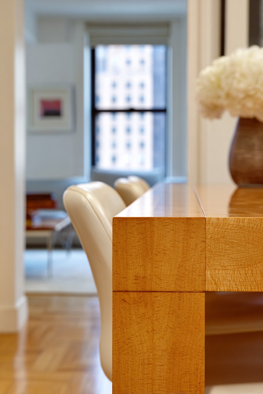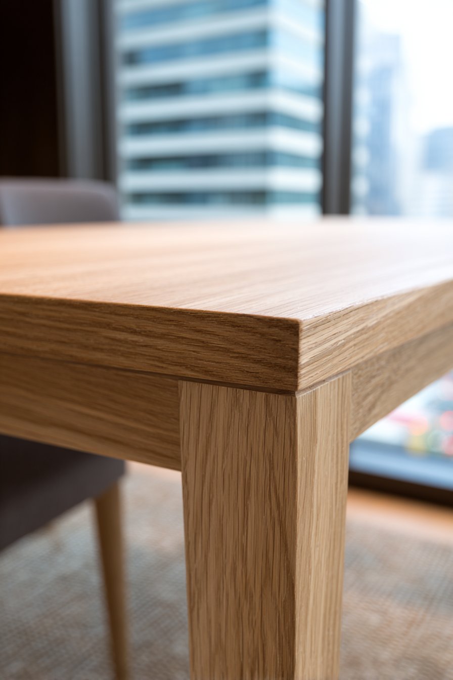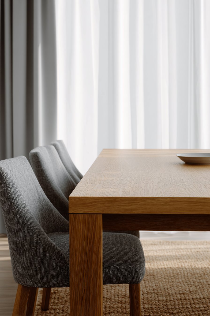 Key Design Tips: Select light oak with consistent grain patterns for a cohesive minimalist look. Choose a satin or matte finish rather than high gloss to maintain understated elegance. Keep the surrounding decor minimal to allow the table’s form and material to remain focal points. Invest in quality upholstered chairs that provide comfort without visual clutter. Maximize natural light sources to enhance the wood’s natural beauty and reduce reliance on artificial lighting. Use a simple jute or wool rug to define the dining zone without competing with the table’s simplicity.