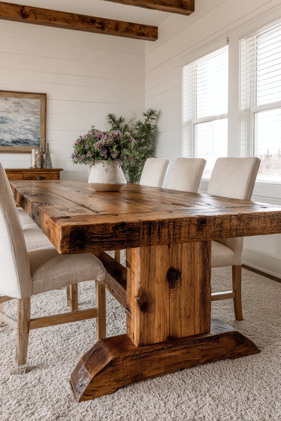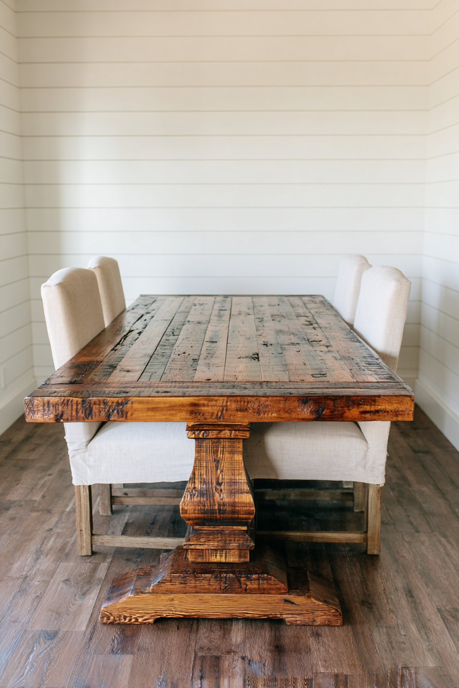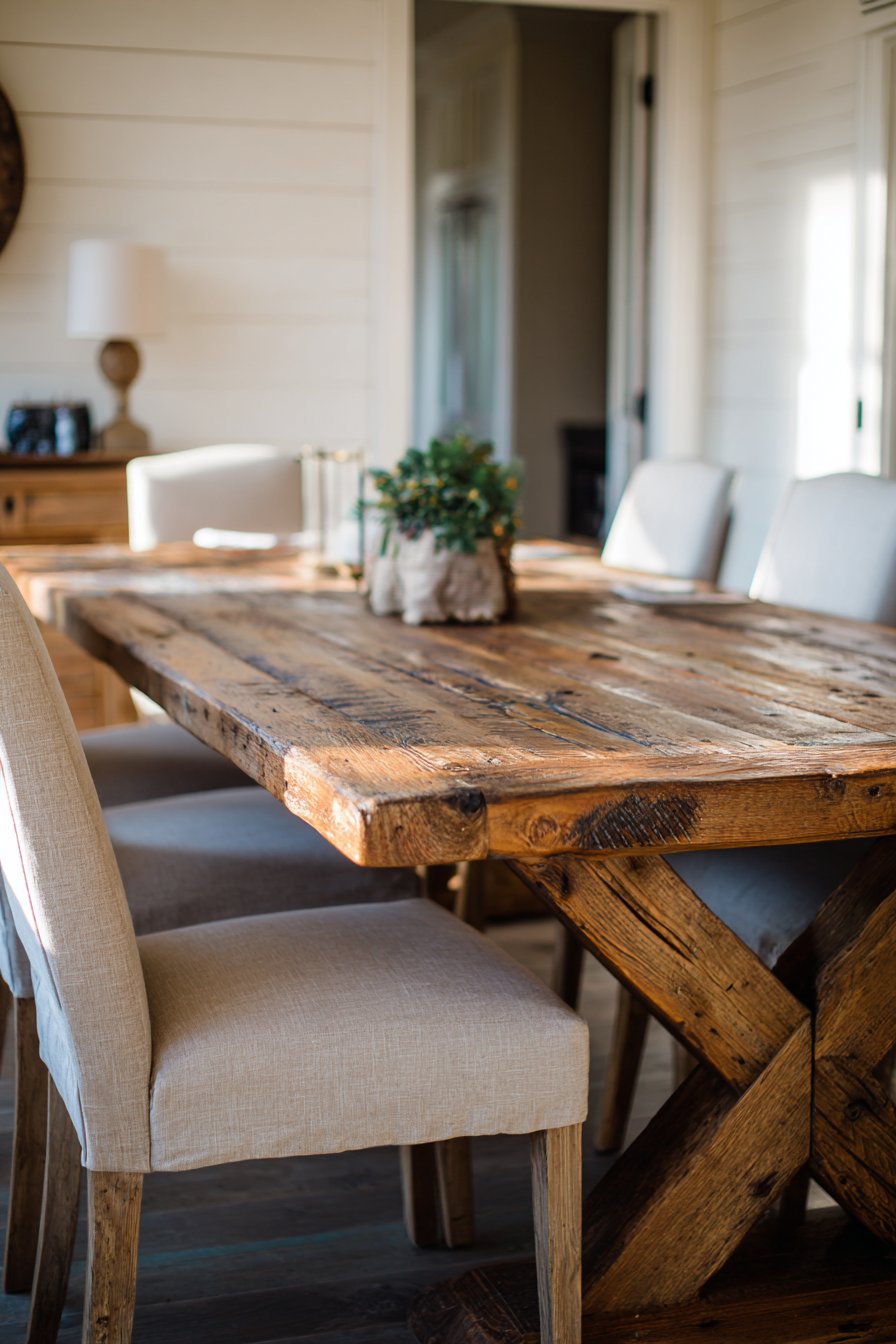 Simple linen-upholstered chairs in neutral tones surround the table, their understated elegance allowing the reclaimed wood to remain the visual focus. Positioned against a shiplap accent wall in a casual dining space, the table creates a relaxed atmosphere appropriate for everyday family meals and informal gatherings. Soft natural light emphasizes the wood’s genuine patina and character marks, celebrating imperfection as authentic beauty rather than damage requiring repair or concealment.