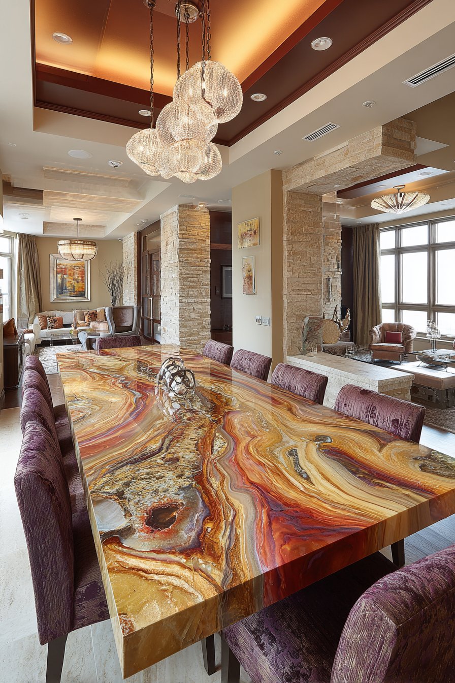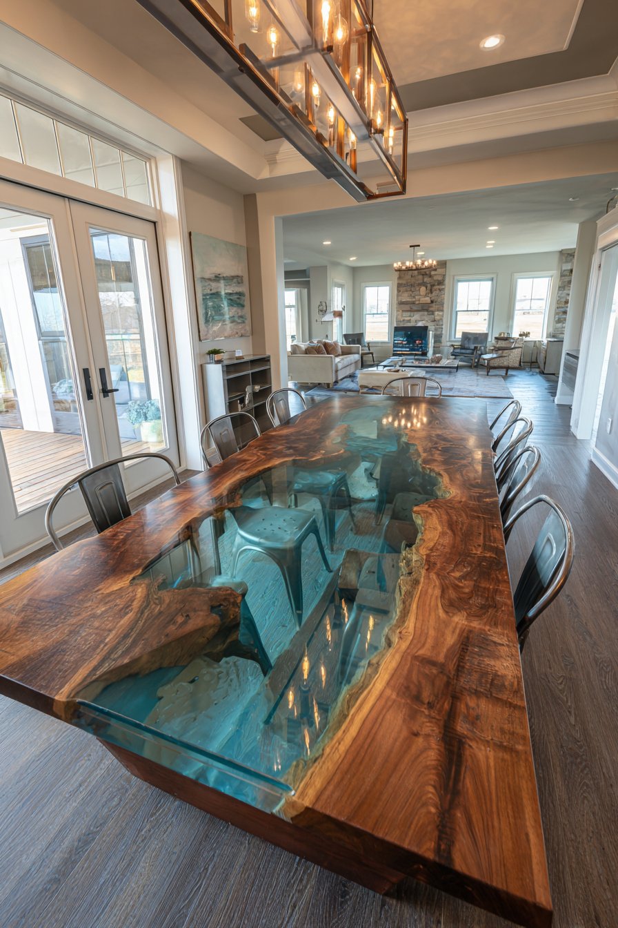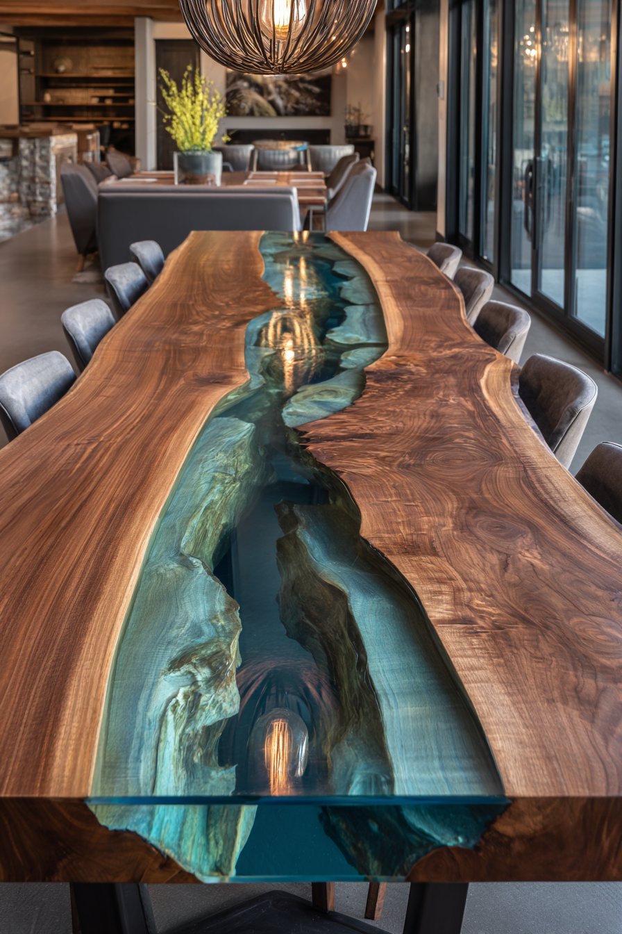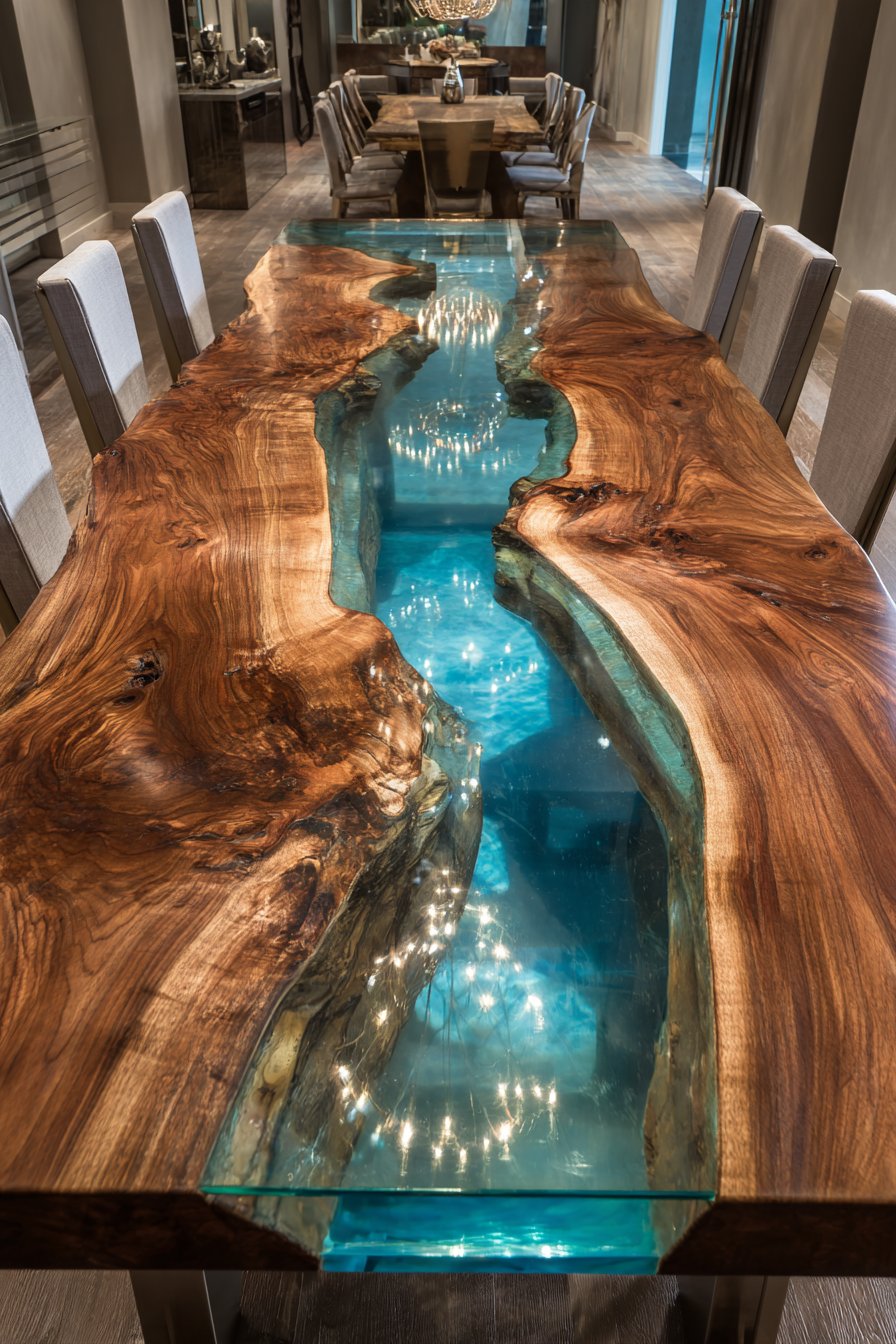 Key Design Tips: Work with experienced craftspeople skilled in both live-edge work and epoxy application. Select high-quality epoxy specifically formulated for furniture applications with UV resistance. Choose wood slabs with interesting grain and edge contours for maximum visual impact. Plan resin color carefully—blues and greens create water effects while clear showcases wood beneath. Ensure proper curing and finishing to prevent yellowing or surface imperfections. Budget significantly—river tables require premium materials and advanced skills. Protect the surface from heat and scratches as epoxy can be more vulnerable than wood. Consider lighting placement to showcase both wood and resin elements effectively.