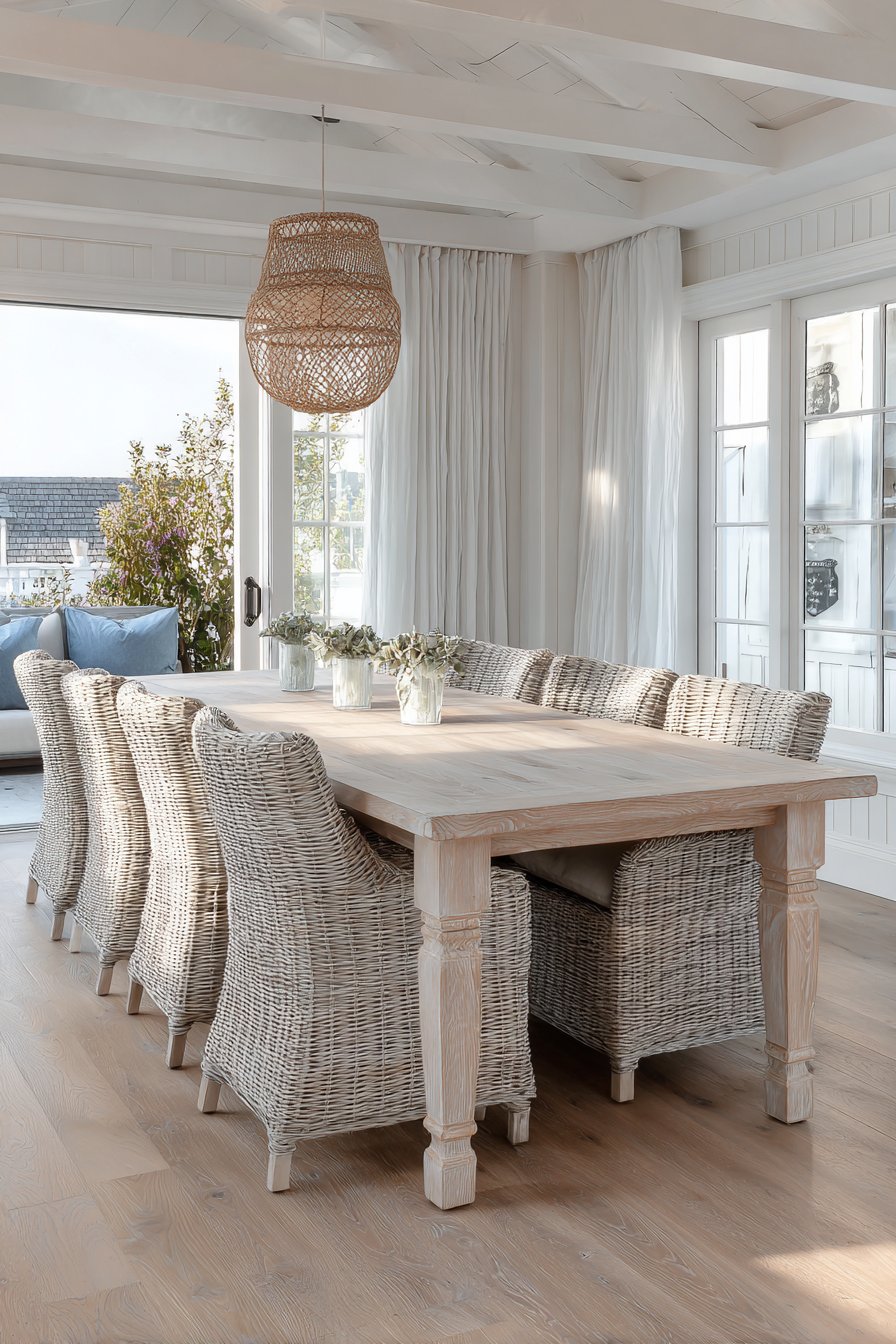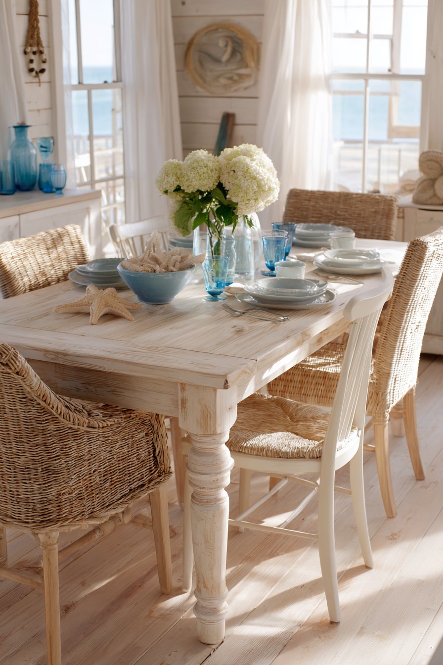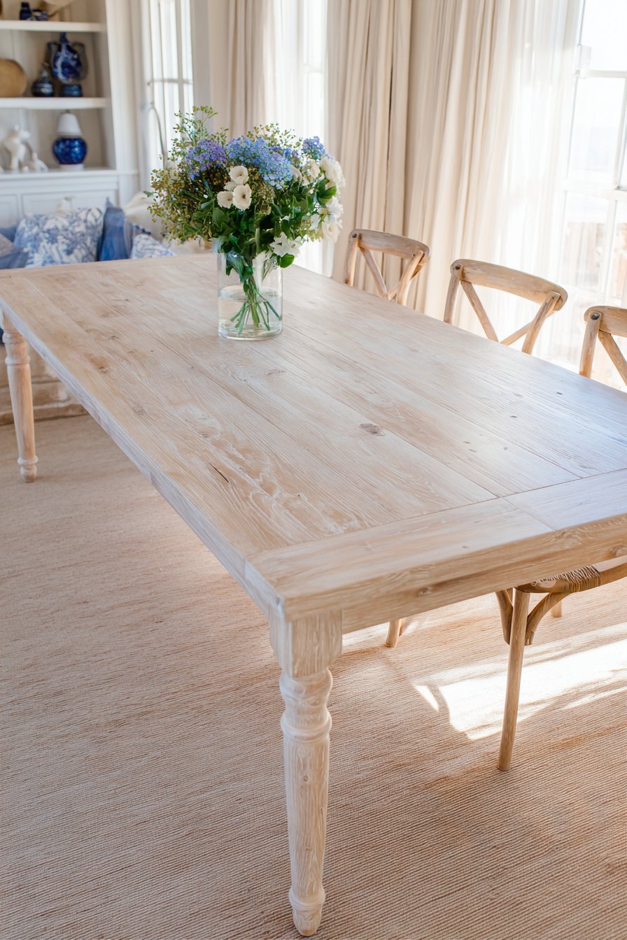 Sun-bleached aesthetics define this coastal-inspired dining table crafted from oak treated to achieve soft whitewashed appearance. The deliberate lightening process preserves visible grain while creating pale tones reminiscent of driftwood weathered by sand, salt, and sun. Simple turned legs and rectangular form keep the design accessible and unpretentious, perfectly suited to casual coastal living. Positioned in a beach house dining room with white beadboard walls and blue accents, the table anchors a relaxed interior that celebrates seaside simplicity.
