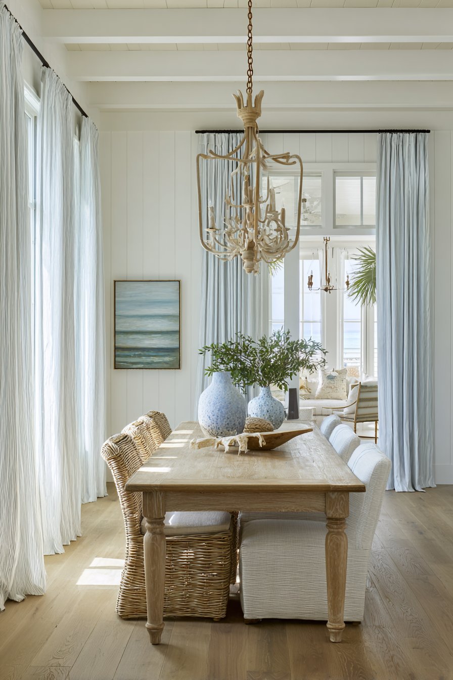 Natural fiber chairs and nautical decor elements complete the coastal theme without veering into kitschy territory. Bright natural light through sheer curtains floods the space, highlighting the oak’s pale bleached tones and creating an airy atmosphere that feels perpetually summer-ready. The deliberate color treatment creates visual continuity with sand, shells, and weathered coastal materials visible through nearby windows.