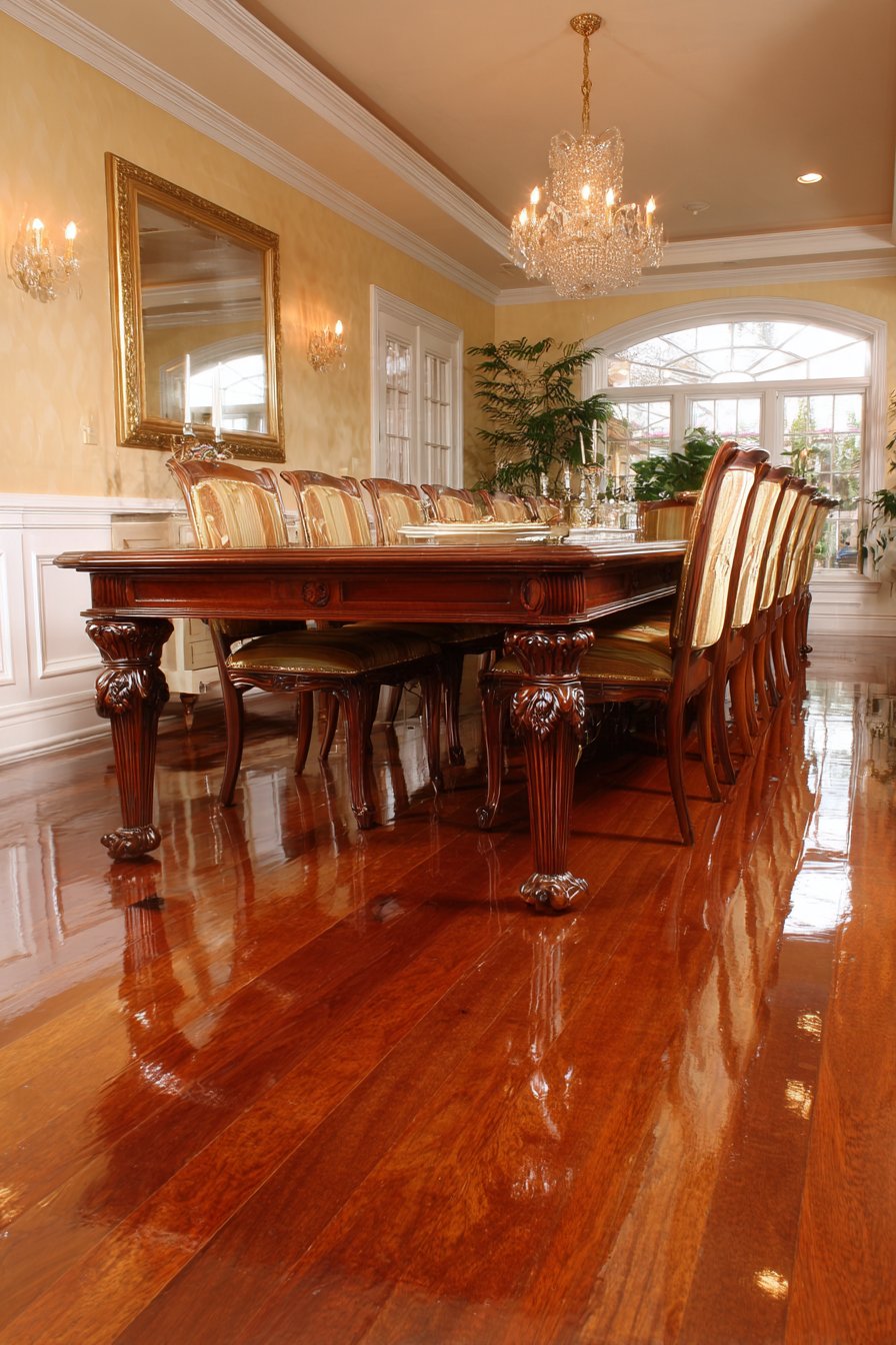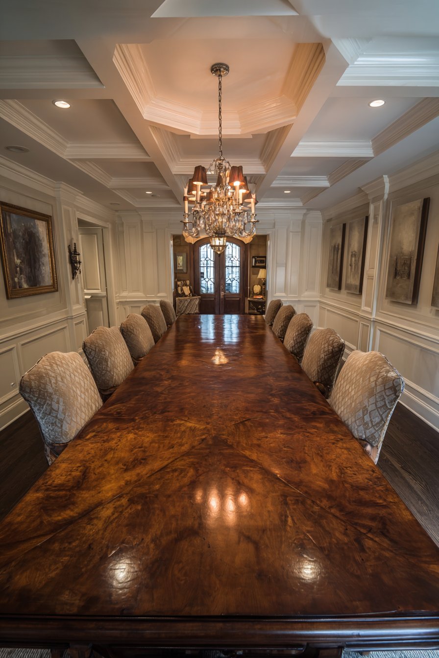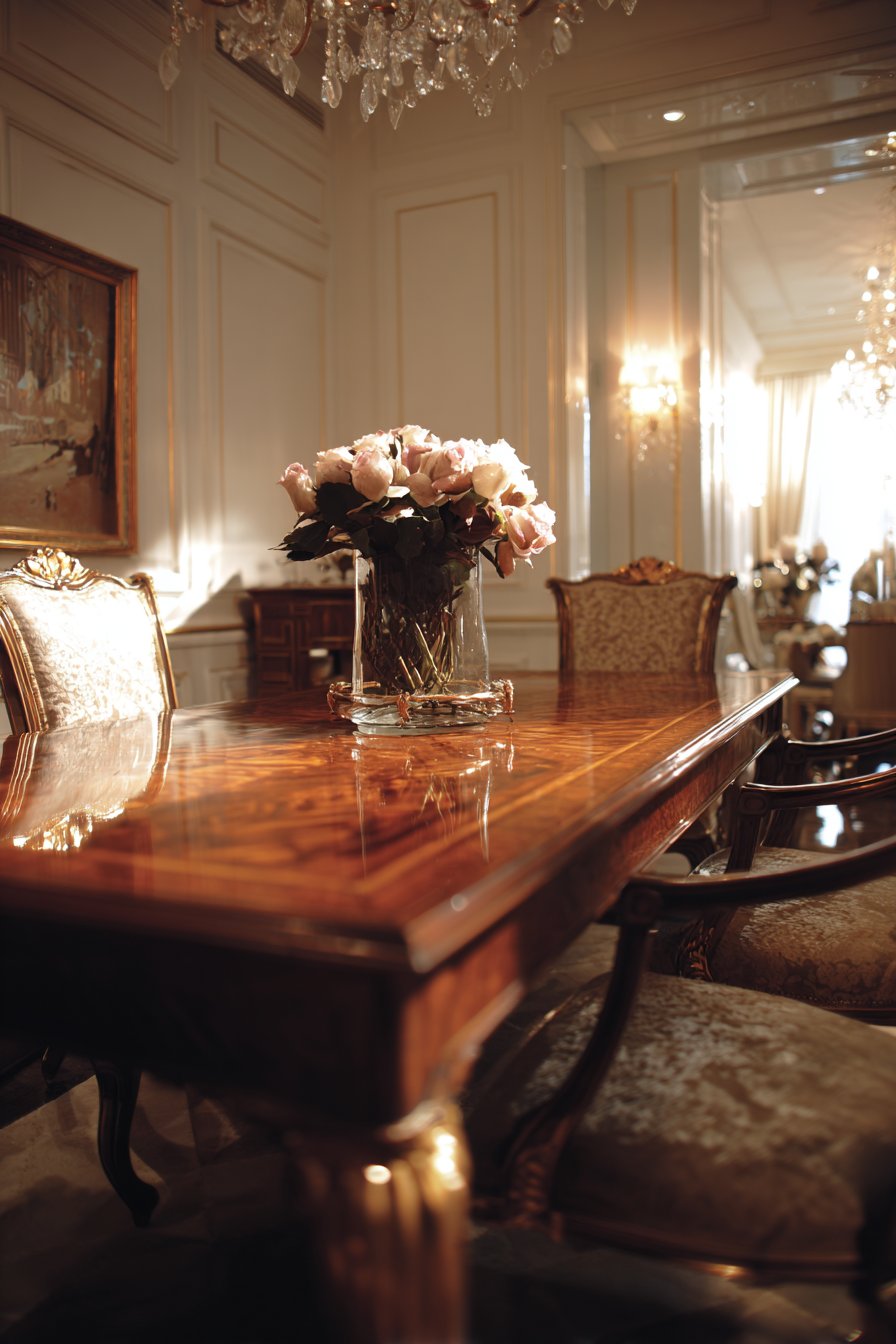 Upholstered wing-back chairs provide formal seating befitting the table’s elegant presence while ensuring guest comfort during extended meals. Soft ambient lighting creates warm reflections on the polished mahogany surface, highlighting the wood’s deep lustrous tones and fine grain. The hand-rubbed finish technique produces depth and warmth impossible to achieve with spray-applied modern finishes, creating tactile and visual richness that improves with careful maintenance over time.