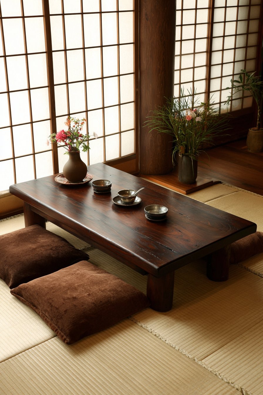 Key Design Tips: Select dense hardwoods like elm that can support weight despite low profile. Apply dark stains that enhance wood grain while creating desired color depth. Provide comfortable floor cushions specifically designed for extended floor sitting. Incorporate Japanese aesthetic elements like shoji screens, tatami, and minimal decoration. Ensure adequate legroom despite low profile—test comfort before committing. Consider cultural context and avoid superficial appropriation of Japanese design elements. Maintain dark finishes with appropriate products that preserve color and sheen. Accept that floor-level dining requires physical flexibility and may not suit all ages or abilities.