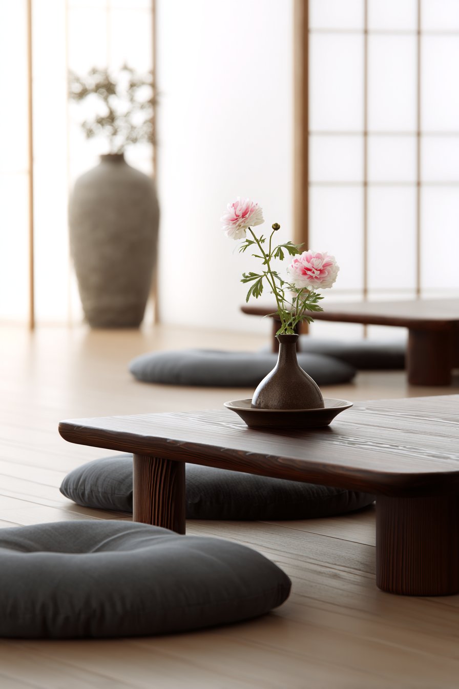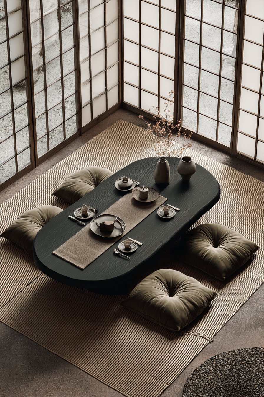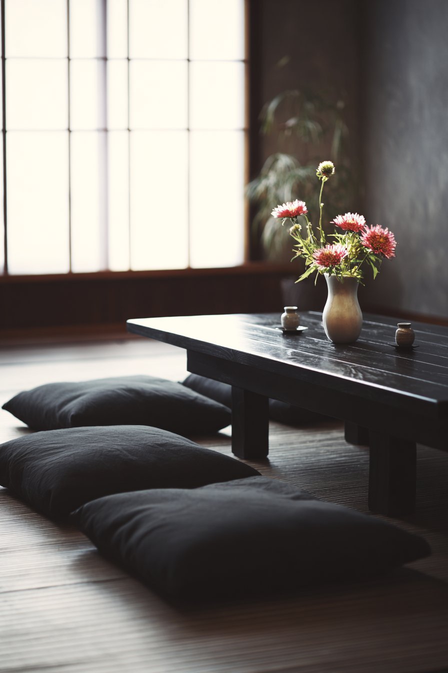 Zen minimalism influences this low dining table crafted from dark-stained elm with clean lines and subtle Asian aesthetic. The table sits close to the floor with short legs, creating intimate dining experience when surrounded by floor cushions rather than chairs. Positioned in a zen-like dining space with tatami-style flooring, the table encourages mindful eating and present-moment awareness through its deliberate break from Western dining conventions. A simple flower arrangement in ceramic vase provides the only decoration needed.