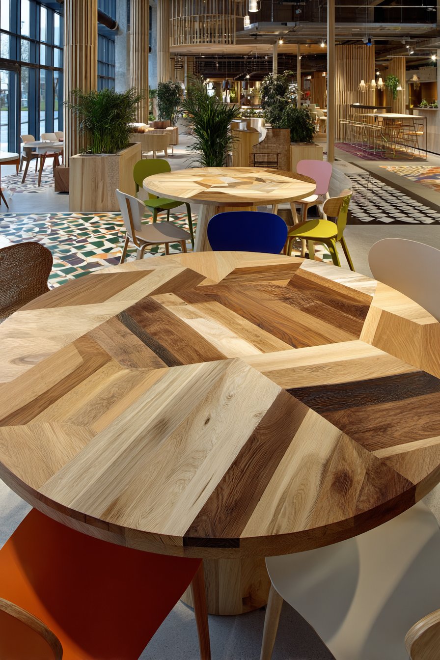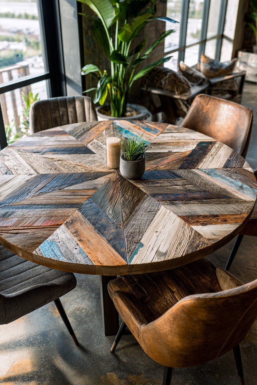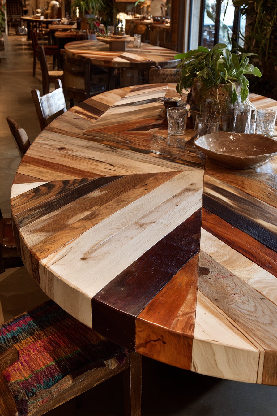 Key Design Tips: Plan geometric patterns carefully before construction to ensure balanced color and grain distribution. Select reclaimed wood species with adequate hardness for dining surface durability. Ensure all pieces receive consistent thickness planing for smooth surface. Apply unified finish across all species despite color variations. Embrace the eclectic aesthetic throughout surrounding decor rather than limiting to table alone. Work with skilled craftspeople who can execute complex geometric joinery accurately. Protect the surface carefully as different wood species have varying scratch resistance. Accept that dramatic visual impact may not suit minimalist or traditional interiors.