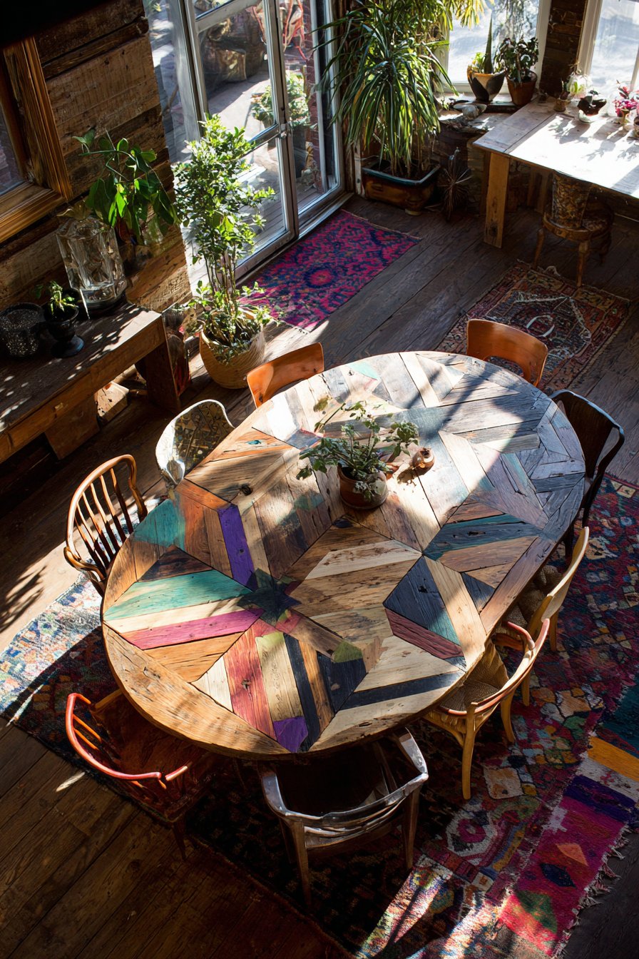 Artistic vision guides this round dining table constructed from multicolored reclaimed wood pieces arranged in geometric pattern. Each section showcases different wood species, creating patchwork effect with varied grains and tones spanning from light maple through medium cherry to dark walnut. Set in a bohemian dining space filled with colorful textiles, plants, and global accessories, the table celebrates diversity, creativity, and the beauty of deliberate eclecticism. Mismatched chairs enhance the collected, personal aesthetic.