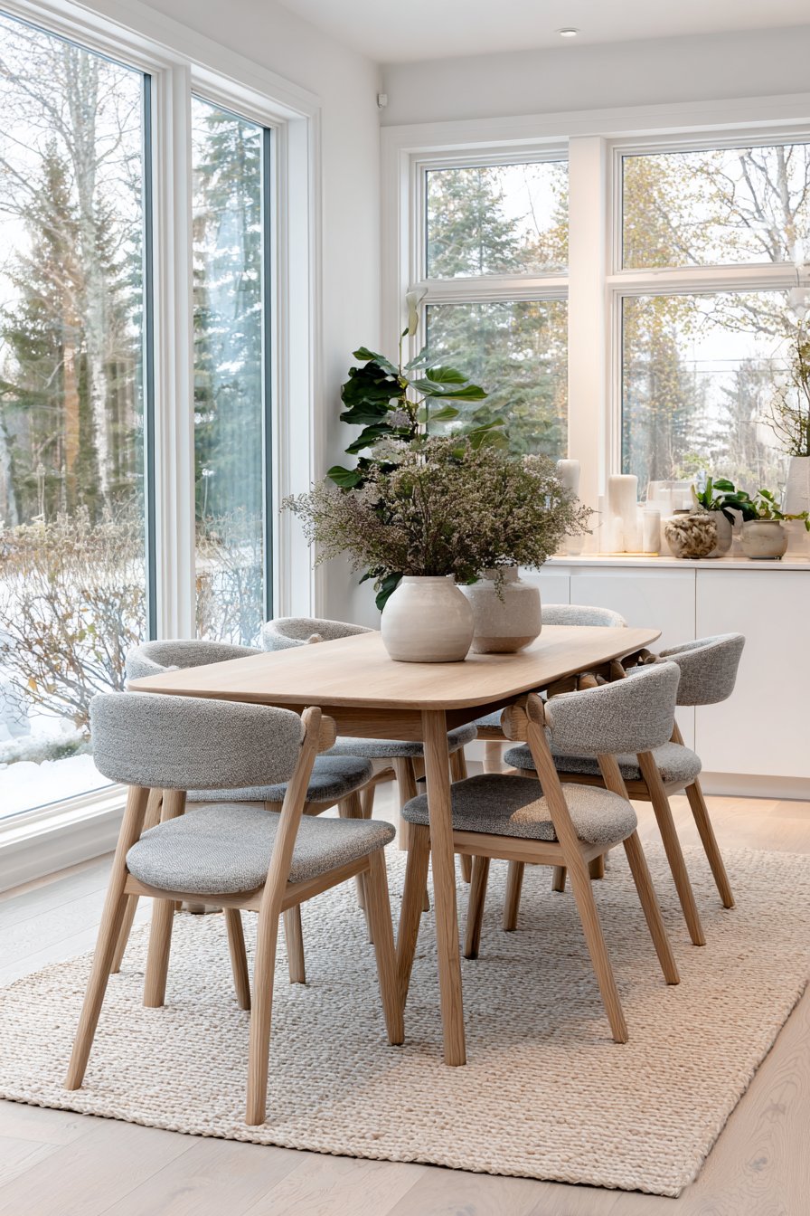 This design demonstrates how restraint and quality materials can create spaces that feel both contemporary and timeless. The light ash wood brings warmth without visual weight, preventing the predominately white room from feeling sterile or cold. Every element serves a clear purpose while contributing to the overall sense of calm and order that characterizes Scandinavian interiors. The result is a dining space that feels welcoming, uncluttered, and perfectly balanced between function and beauty.
