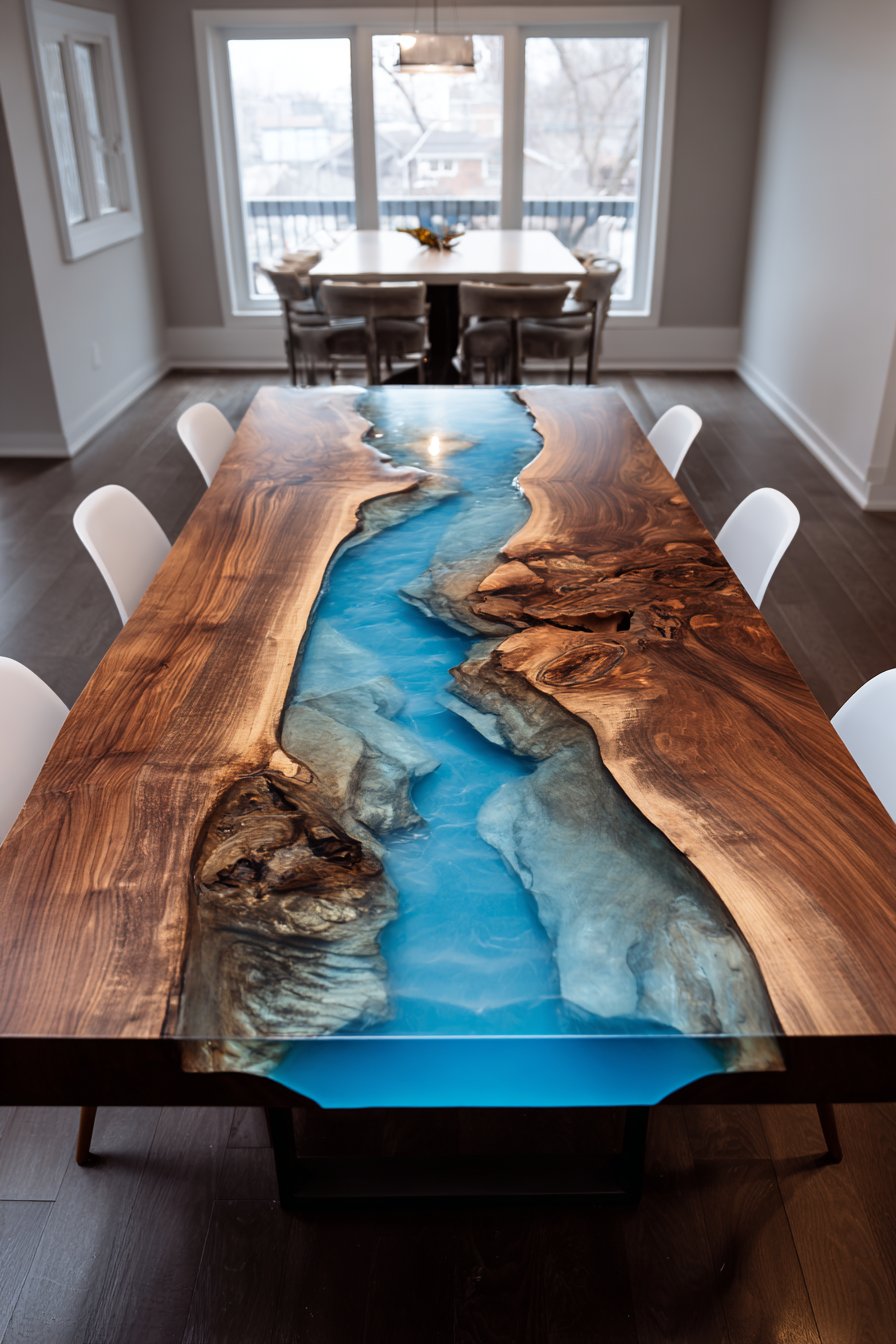 Artistic innovation meets natural beauty in this river table concept where live-edge walnut slabs are split and rejoined with translucent blue epoxy resin creating the illusion of flowing water through wood. The organic edges and rich brown walnut provide dramatic contrast with azure resin that catches and refracts light like actual water. Positioned as statement piece in contemporary dining room, the table functions as both furniture and conversation-starting artwork. Modern metal chairs provide seating without competing with the table’s visual drama.