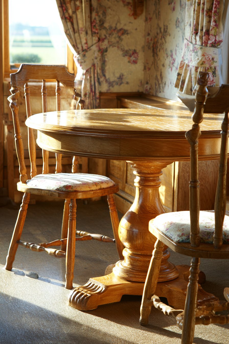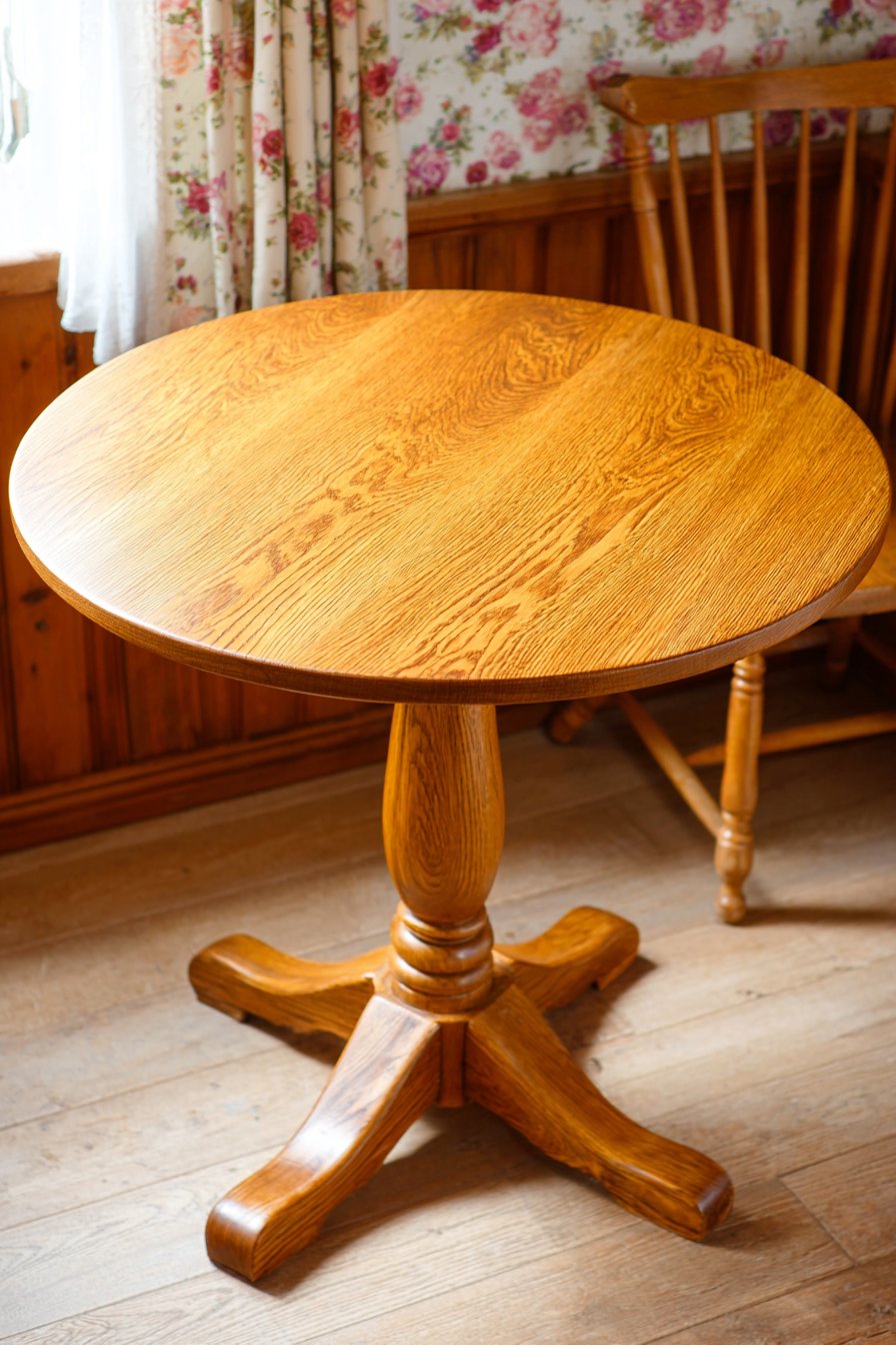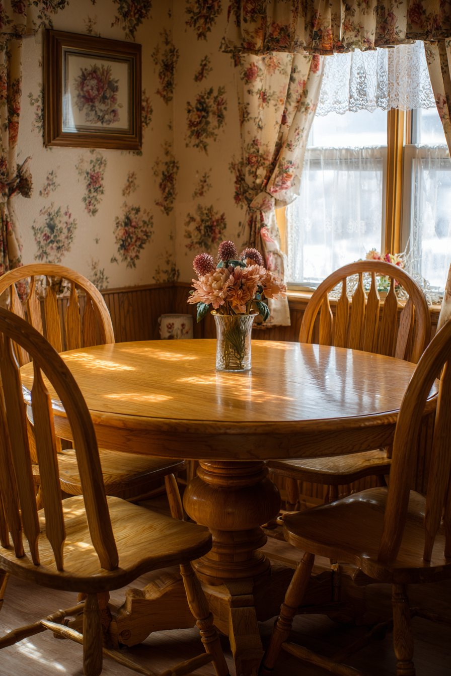 Key Design Tips: Choose solid oak with prominent cathedral grain for authentic traditional appearance. Select pedestal bases with substantial column diameter for visual and structural stability. Coordinate chair finishes with table for traditional matched-set aesthetic. Apply satin varnish rather than high gloss for appropriate period appearance. Incorporate other traditional elements like floral patterns, lace, and vintage accessories. Maintain varnished surfaces with appropriate cleaners that don’t damage finish. Consider the pedestal base diameter to ensure adequate leg room for comfortable seating. Accept that traditional styling may not suit contemporary or minimalist interiors.