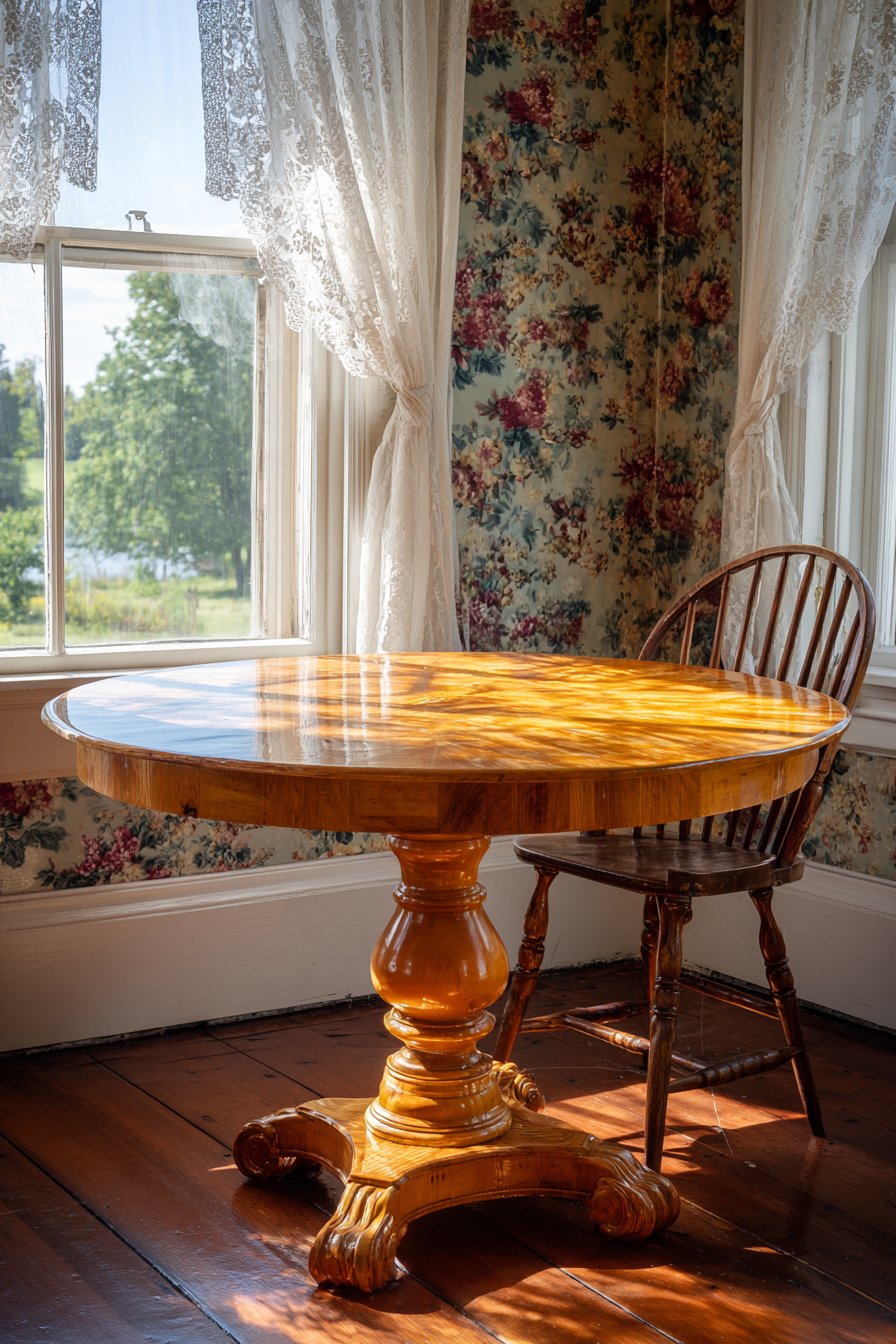 Natural window light creates soft highlights on the wood surface while lace curtains filter harsh glare, creating romantic diffused atmosphere. The pedestal base’s ornate turning work and claw feet demonstrate traditional woodworking skills increasingly rare in contemporary furniture manufacturing. Cathedral grain’s natural drama provides visual interest without requiring additional ornamentation or decoration.
