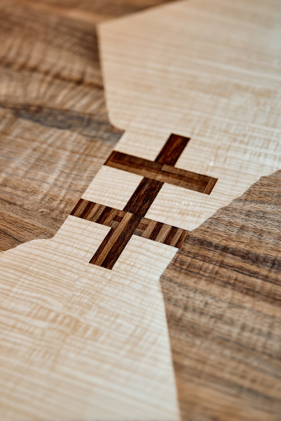 Detail-focused photography highlights the precision butterfly joints and the striking contrast between walnut and maple. Each butterfly represents skilled hand work—cutting the joint, shaping the contrasting wood, and fitting with precision that ensures both structural integrity and visual appeal. The visible joinery creates conversation piece while demonstrating transparency about construction methods and honest use of materials.