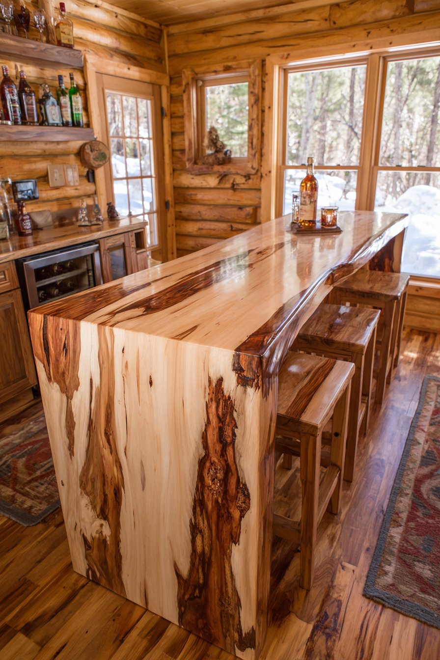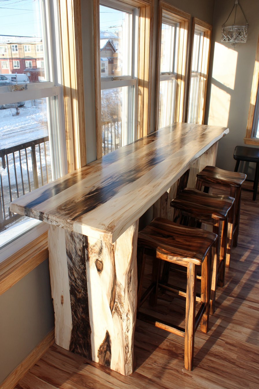 The counter height positions diners at comfortable elevation for conversation with those working in adjacent kitchen, blurring boundaries between cooking and dining activities. Hickory’s hardness and density ensure durability appropriate for high-traffic kitchen dining, while the natural color variation creates visual movement and organic interest impossible to achieve with artificially stained or painted surfaces. The wood’s honest, unfussy character matches the casual entertaining approach.