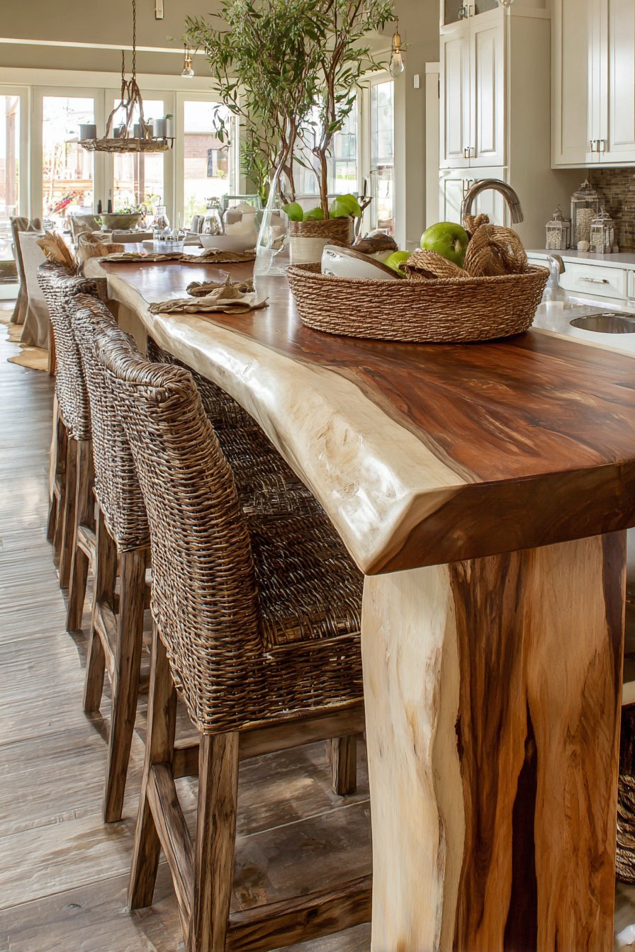 This design suits those who value open, social kitchen environments where cooking and eating flow together naturally. The counter height and backless seating create informal atmosphere that encourages lingering conversations and spontaneous gatherings. Hickory’s dramatic natural coloring provides built-in character that requires no artificial enhancement, celebrating wood’s inherent beauty.