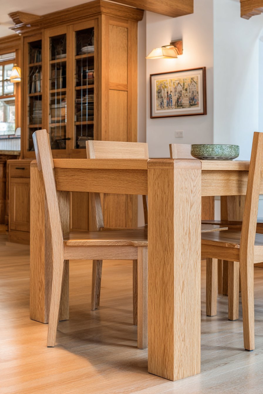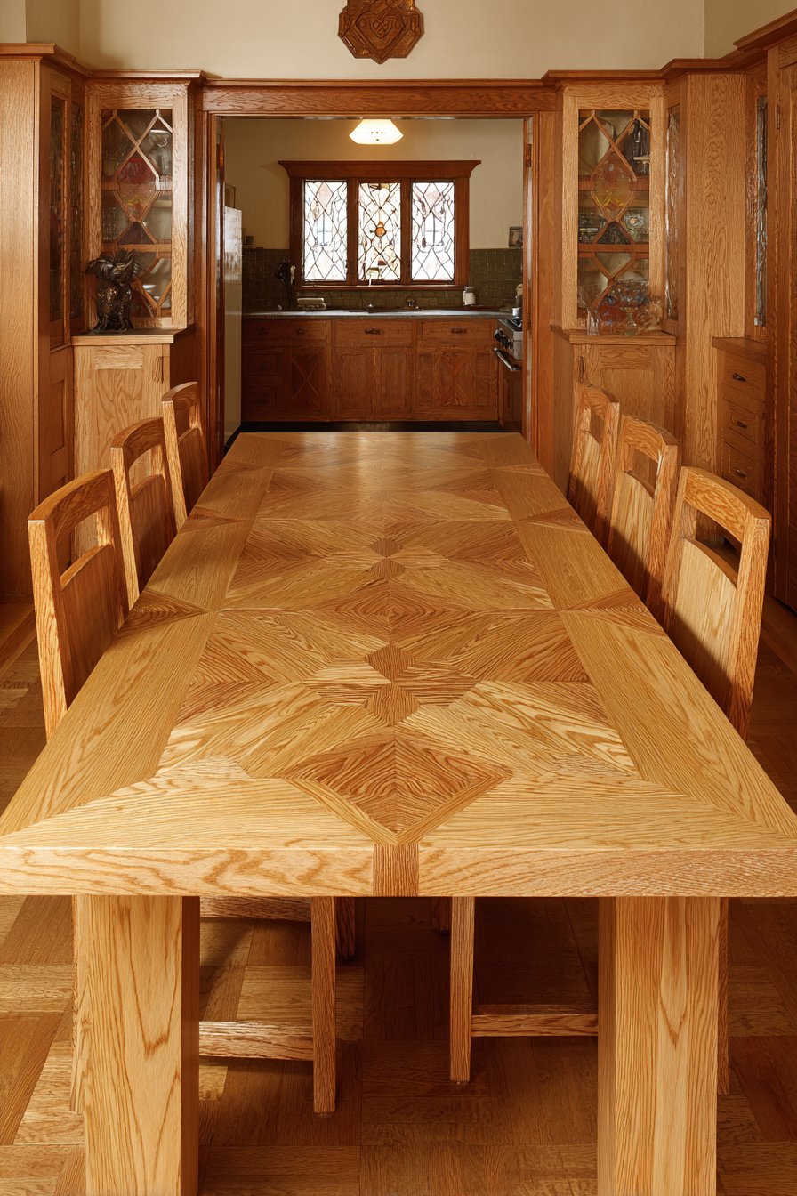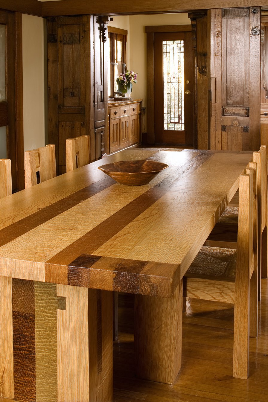 Arts and Crafts principles guide this parsons-style dining table in quarter-sawn white oak featuring distinctive ray fleck figure creating tiger-stripe patterns. The table features thick geometric legs and minimal ornamentation, letting wood character provide all necessary visual interest. Positioned in craftsman bungalow dining room with built-in cabinetry in matching oak, the table embodies Arts and Crafts movement ideals of honest materials, visible grain, and form following function. Period-appropriate chairs complete the historically informed interior.