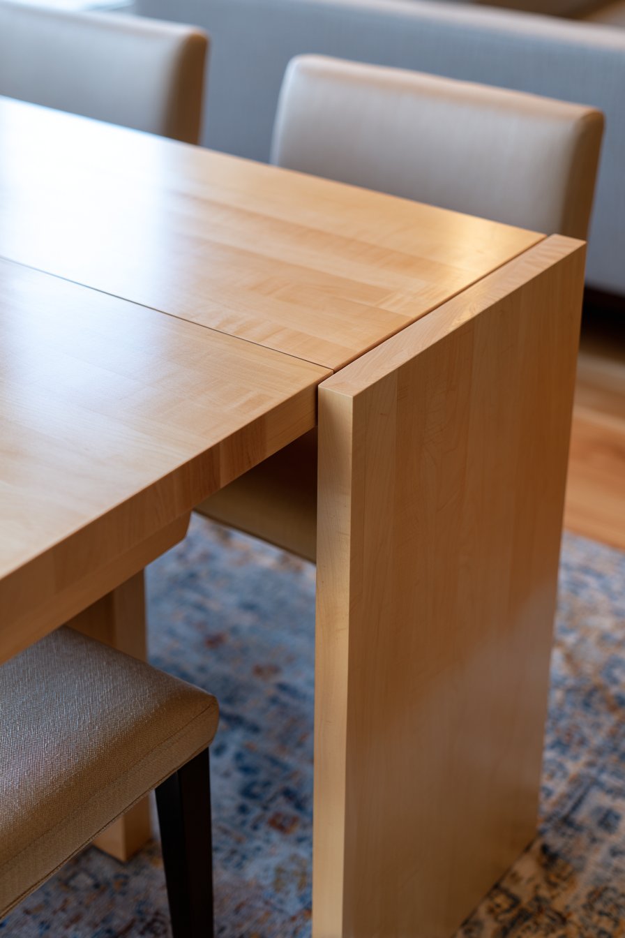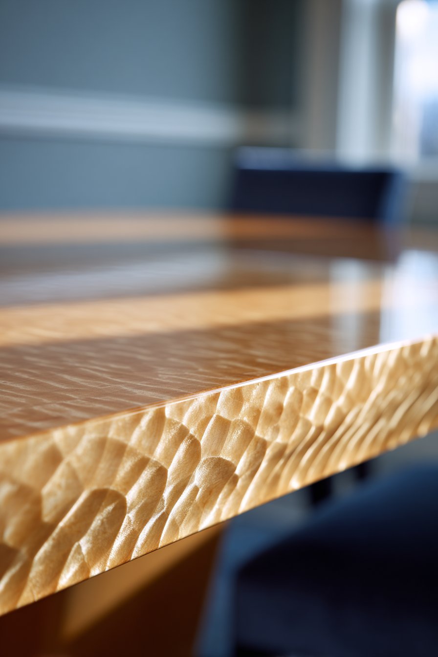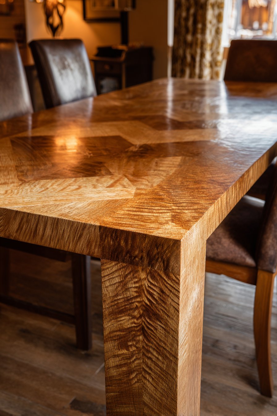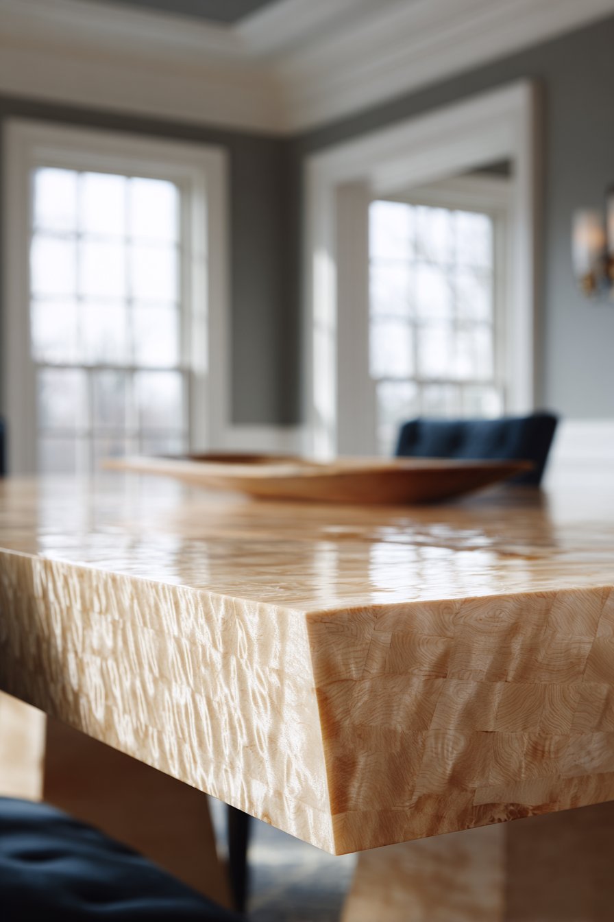Key Design Tips: Source figured maple from reputable suppliers who can verify wood quality and origin. Apply clear finishes that enhance chatoyance without yellowing or obscuring grain patterns. Position the table where natural and artificial light can showcase the figure from multiple angles. Choose simple, elegant seating that complements without competing with the wood’s visual drama. Consider professional finishing to achieve optimal clarity and depth in the lacquer application. Protect the surface with quality placemats and trivets to preserve the finish. Understand that highly figured wood commands premium pricing but offers unique beauty unavailable in plain-sawn lumber.