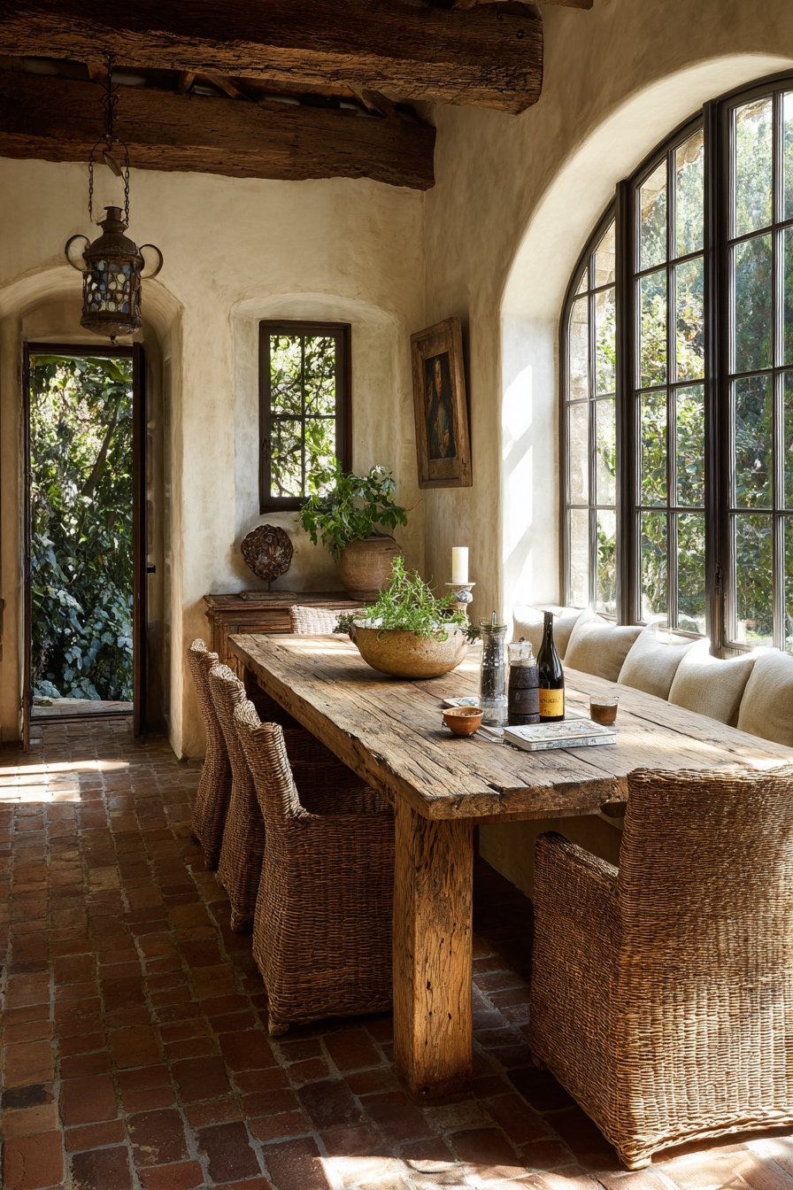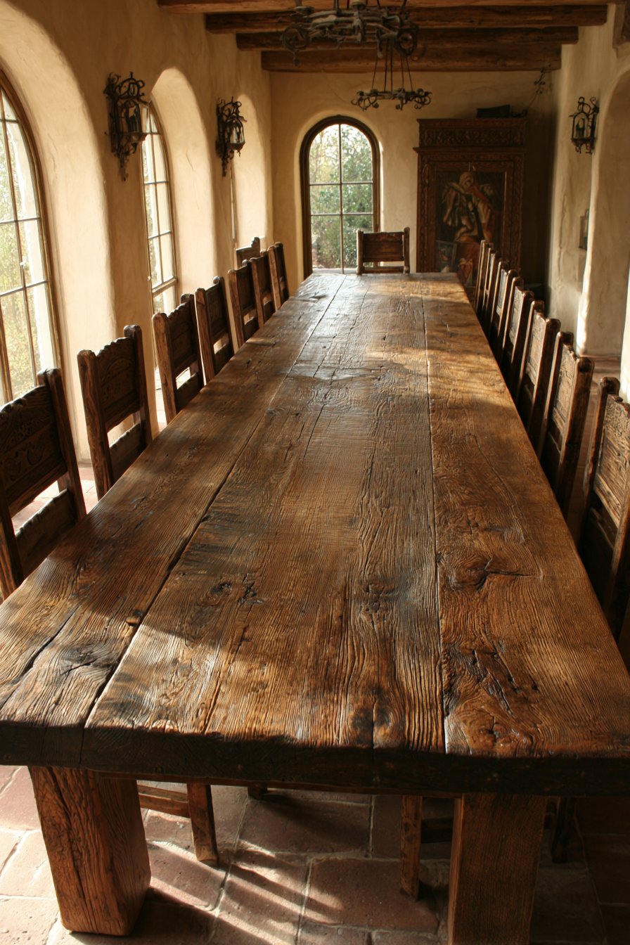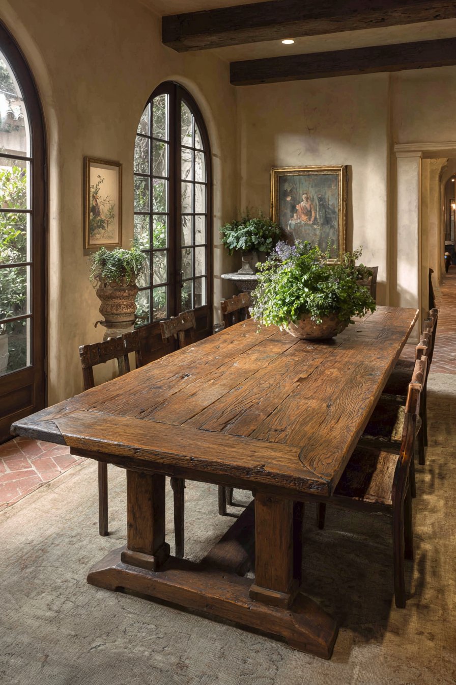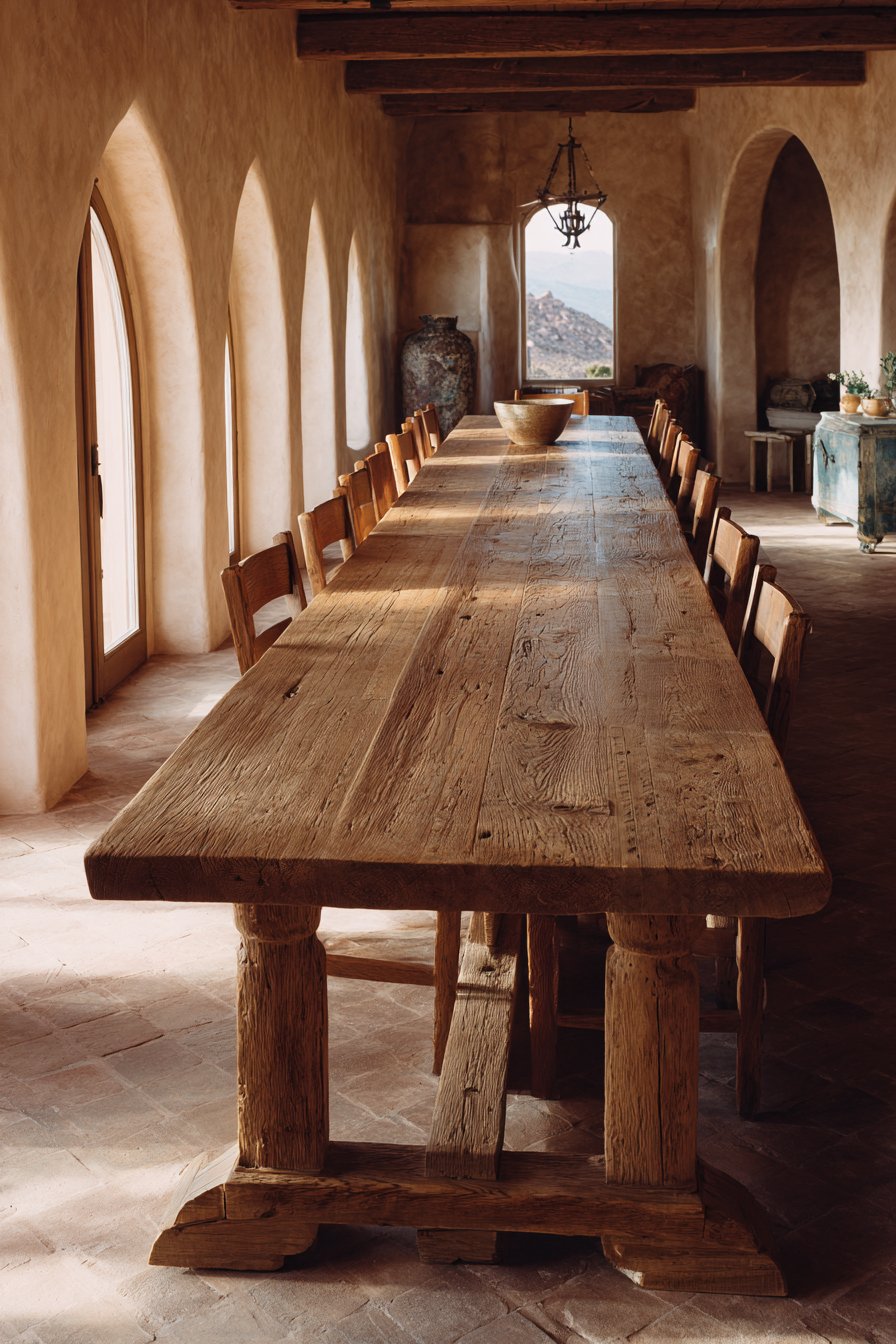 Key Design Tips: Choose chestnut or similar species with warm tones and aging characteristics appropriate to Mediterranean aesthetic. Apply finishing techniques that suggest age without falsifying antique status. Select refectory proportions—long and relatively narrow—for authentic monastery table form. Pair with simple rush or ladder-back seating appropriate to humble monastery origins. Incorporate Mediterranean architectural elements like stucco, terracotta, and arched openings. Accept and celebrate wear patterns as contributing to authentic aged appearance. Maintain with gentle cleaning that preserves patina rather than restoring to new condition. Understand that authentic monastery aesthetic suits specific architectural and decorative contexts best.