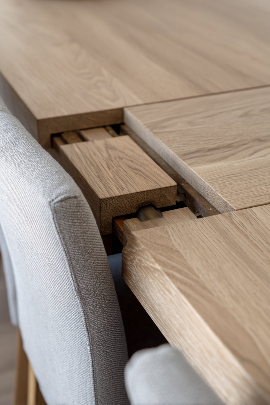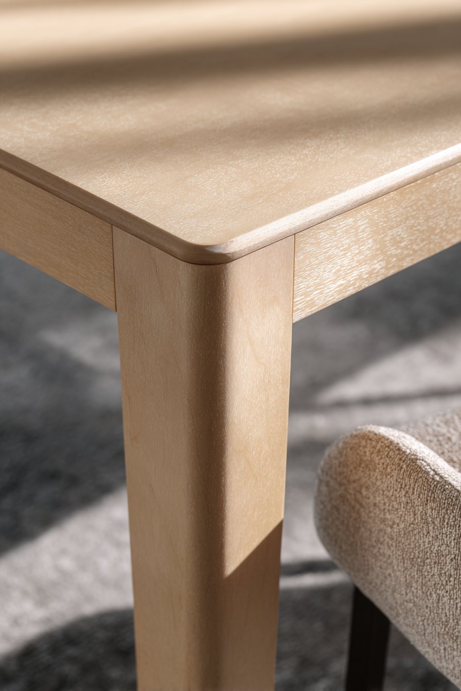 Professional photography captures both the table’s elegant simplicity in compact form and its practical versatility when extended. The beech’s fine, even texture and pale neutral tones create visual lightness appropriate for multi-purpose spaces where furniture must adapt to changing needs throughout the day. The smooth surface and clean lines maintain sophisticated appearance whether serving as desk, dining table, or entertaining surface.
