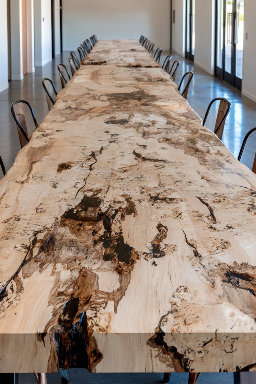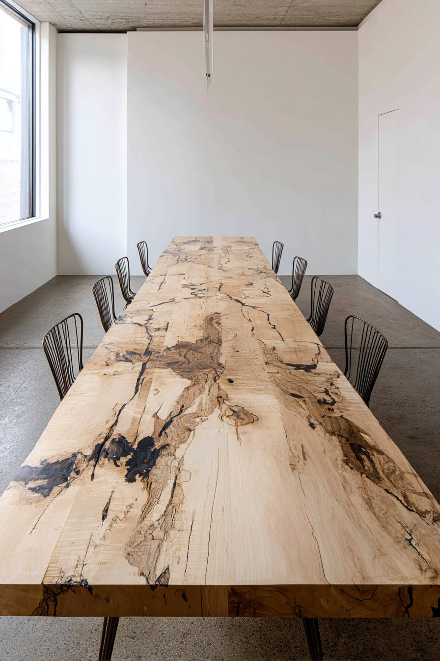 Nature’s artistic intervention creates this extraordinary dining table in spalted maple featuring black line patterns from fungal growth creating abstract organic artwork within the wood itself. Each board displays unique spalting patterns making the table genuinely one-of-a-kind, impossible to replicate or reproduce. The contemporary table sits in gallery-like dining space with white walls that function as neutral backdrop, allowing the wood to command complete attention as functional sculpture. Minimalist black metal chairs frame the artistic table without visual competition.
