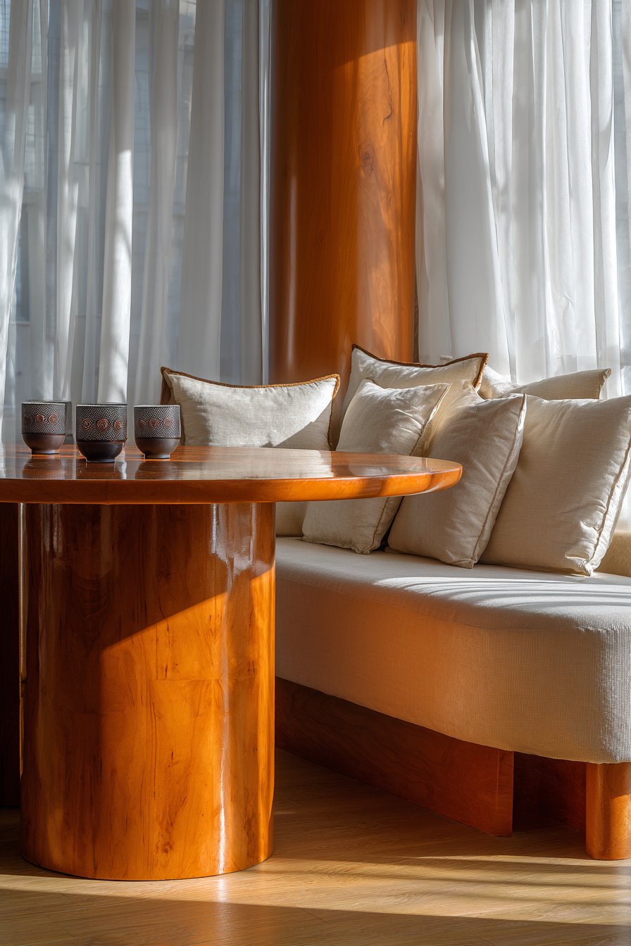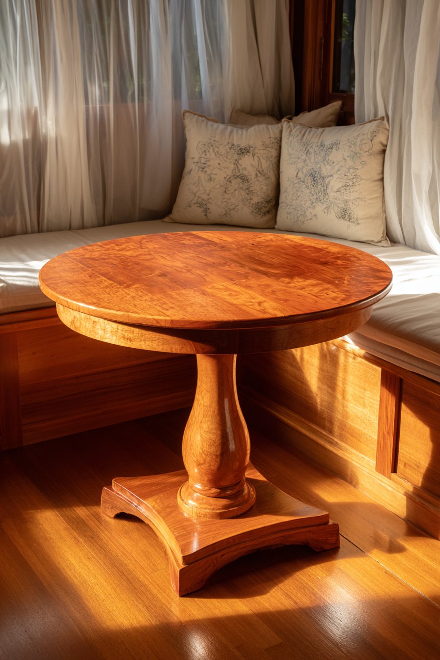 Morning sunlight filtering through sheer curtains creates a luminous quality in the space, casting soft highlights across the polished cherry surface and illuminating the wood’s fine, straight grain. The single pedestal base provides leg room flexibility, allowing diners to sit comfortably without navigating multiple table legs—a practical consideration in smaller dining areas. The table’s circular form encourages conversation and creates a democratic seating arrangement where no position feels more prominent than another.