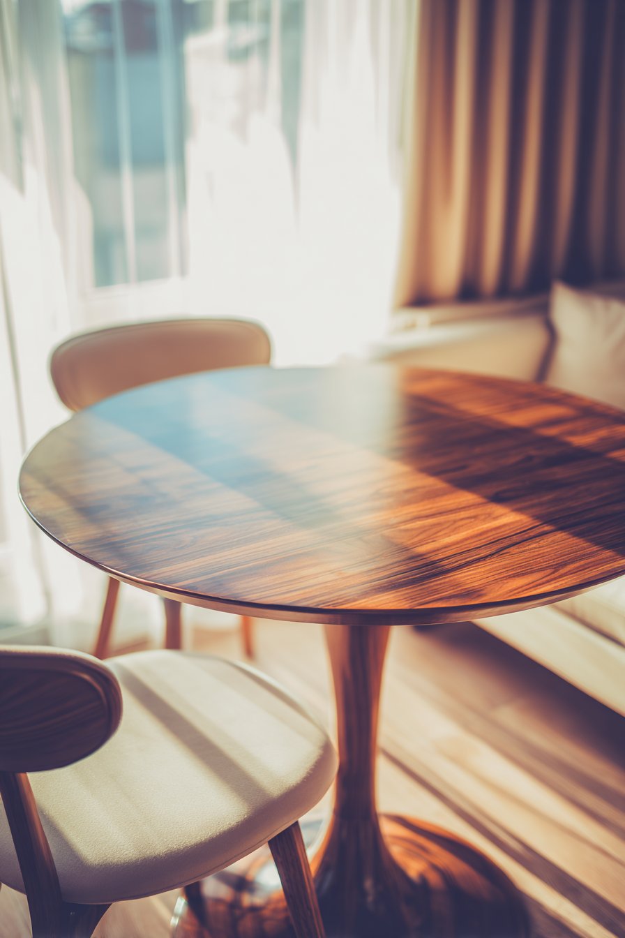 Key Design Tips: Choose round tables for small spaces to improve traffic flow and maximize seating capacity. Opt for pedestal bases rather than four-leg designs to provide flexible leg room. Select cherry wood for its warm tones and aging characteristics that improve over time. Position the table near natural light sources to showcase the wood’s lustrous finish. Pair with built-in seating or benches to save space and create cohesive custom appearance. Use sheer window treatments to diffuse light while maintaining privacy and softening the overall ambiance.