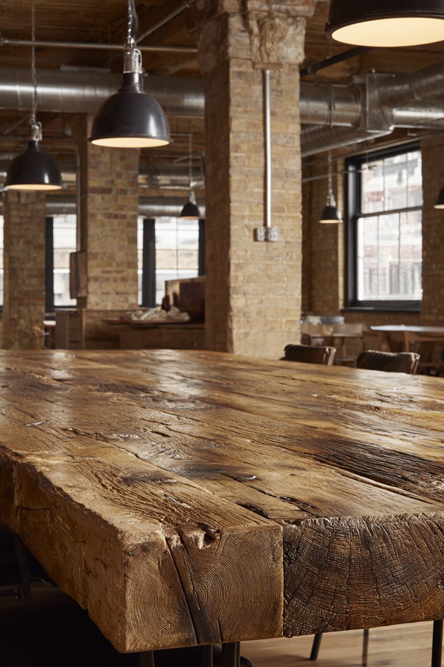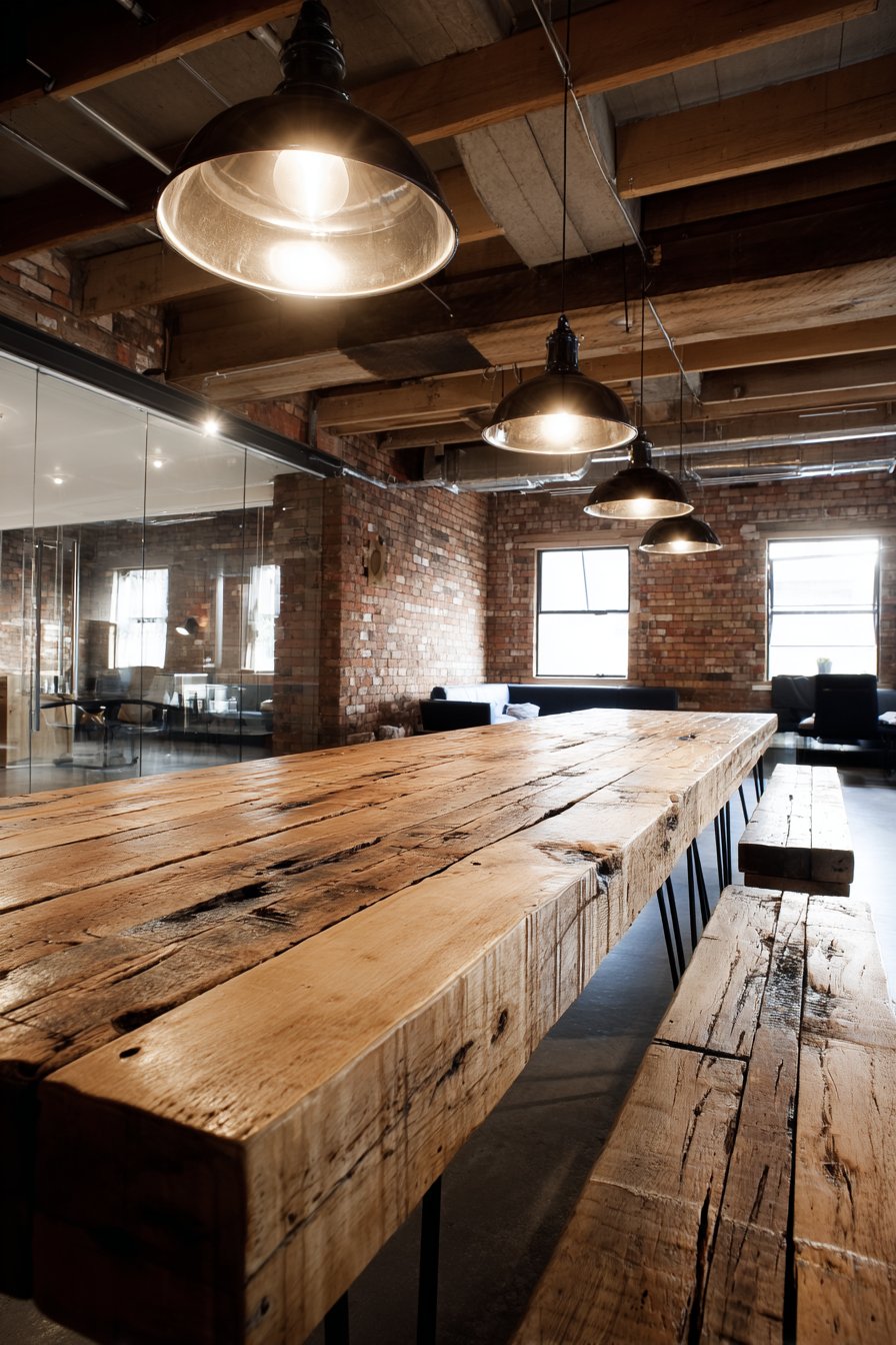 Raw industrial aesthetics meet organic warmth in this striking table design that combines a thick reclaimed wood top with black metal hairpin legs. The wood surface showcases visible saw marks, natural imperfections, and varied tones ranging from honey blonde to deep espresso—authentic characteristics that celebrate the material’s previous life and journey. Set against exposed brick walls and concrete floors in a converted loft apartment, the table bridges the gap between rugged industrial elements and the softness of natural wood grain.