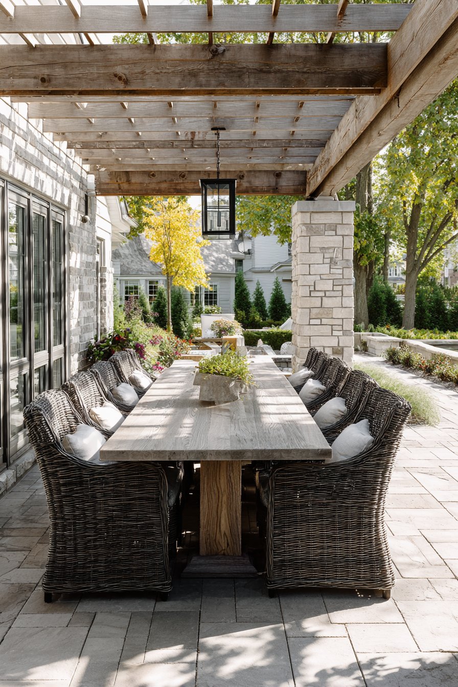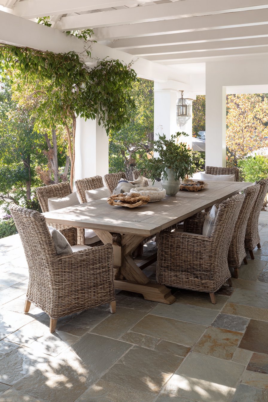 Designed specifically for al fresco entertaining, this weathered teak dining table embraces the natural aging process that occurs when premium hardwood weathers outdoors. The rectangular table seats ten generously, its surface displaying the characteristic silvery-gray patina that develops as teak weathers under sun and rain exposure. Positioned on a covered patio with stone flooring, the table creates an elegant outdoor dining destination that withstands the elements while developing greater character over time.