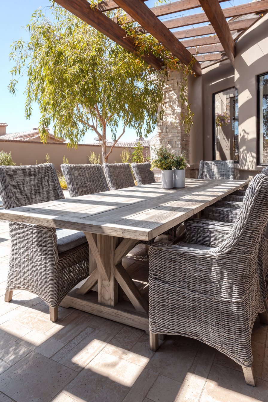 Wicker dining chairs with weather-resistant cushions surround the table, their natural textures complementing the teak’s organic beauty while providing comfortable seating for extended outdoor meals. Overhead, a pergola filters sunlight, creating dappled light patterns that dance across the weathered wood surface throughout the day. This interplay of light and shadow emphasizes the teak’s grain structure and subtle color variations, creating ever-changing visual interest that makes outdoor dining feel like a special occasion.