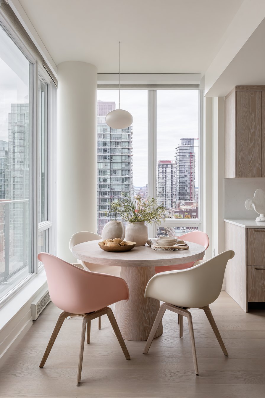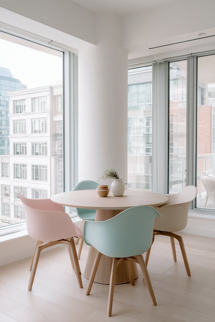 Positioned in a minimalist dining room with white walls and light maple flooring, the table creates a cohesive neutral palette that feels airy and spacious. Four iconic mid-century modern molded plastic chairs in soft pastels—perhaps powder blue, blush pink, sage green, and butter yellow—provide pops of subtle color without overwhelming the serene atmosphere. Large windows flood the space with natural light, a crucial element in Scandinavian interiors where maximizing daylight helps combat long winter darkness.
