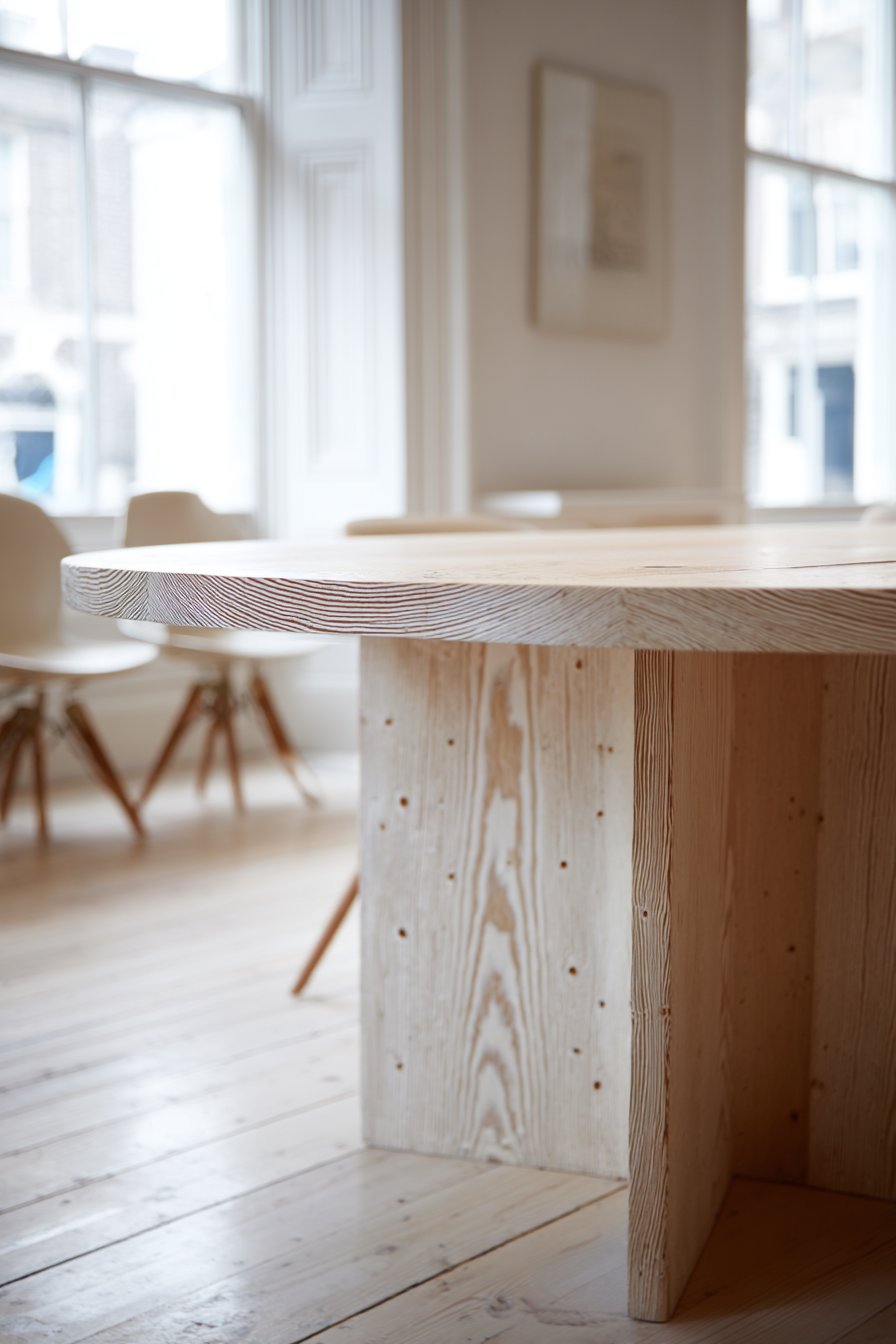 Quintessentially Nordic in its approach, this circular dining table in light ash wood embodies Scandinavian design principles of simplicity, functionality, and connection to nature. The wood’s subtle grain pattern and pale blonde tones create a luminous quality enhanced by natural oil finish that protects while preserving the wood’s organic feel. A single central pedestal base provides clean lines characteristic of Scandinavian aesthetics while offering practical benefits in terms of leg room and visual lightness.