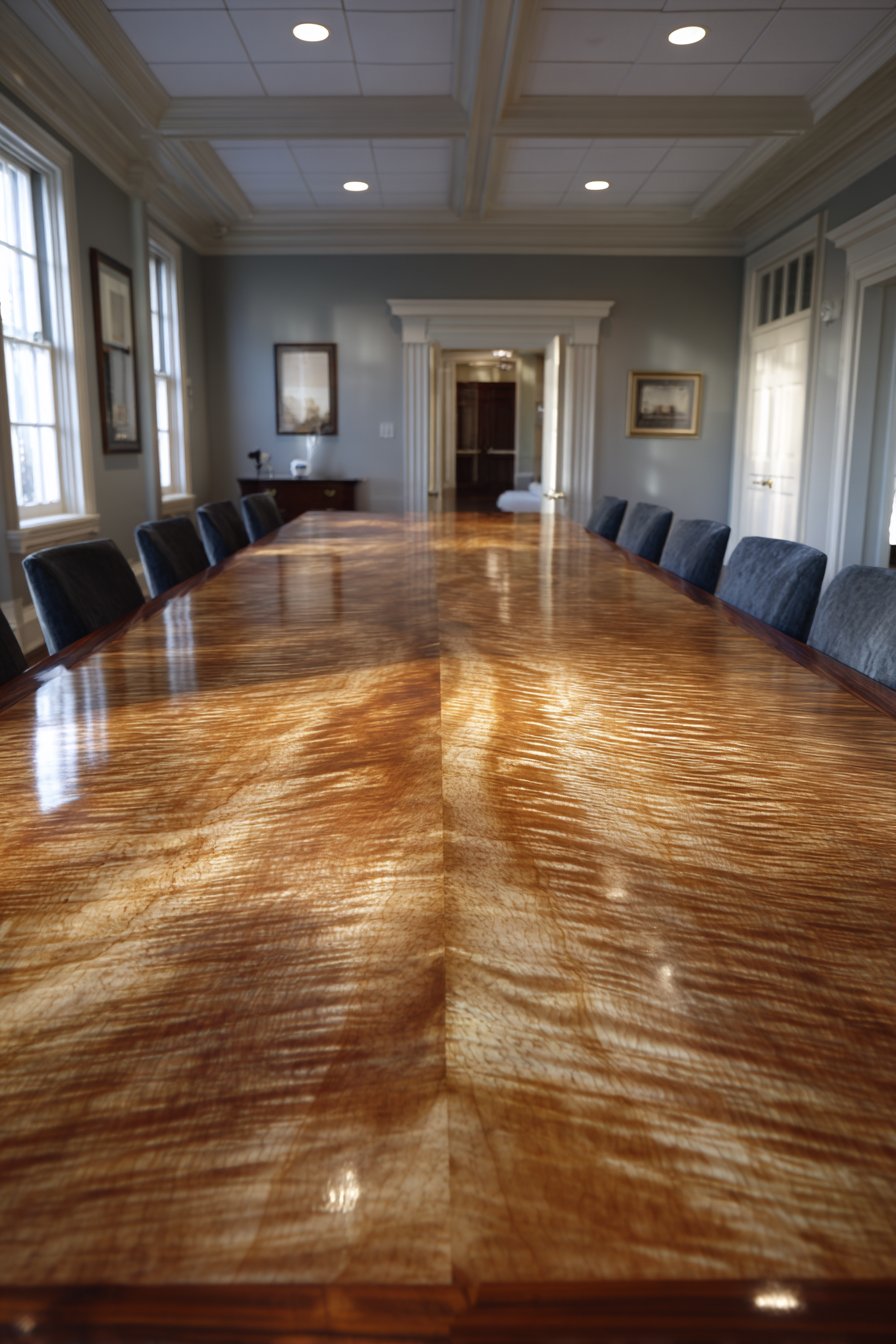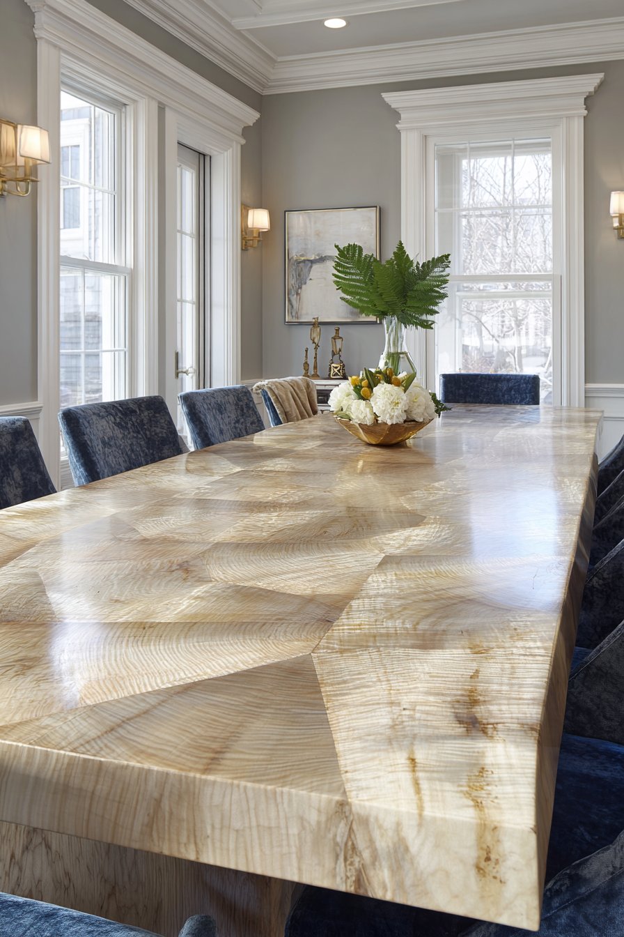 Placed in a formal dining room with elegant crown molding and soft gray walls, the table commands attention through its exceptional wood figure rather than elaborate ornamentation. Upholstered dining chairs in navy velvet provide rich color contrast while maintaining the room’s sophisticated atmosphere. The restraint shown in surrounding decor allows the figured maple to shine as the room’s centerpiece, demonstrating how remarkable wood grain can eliminate the need for additional decorative elements.